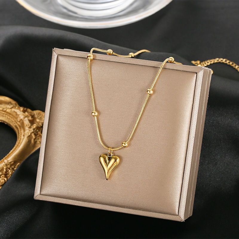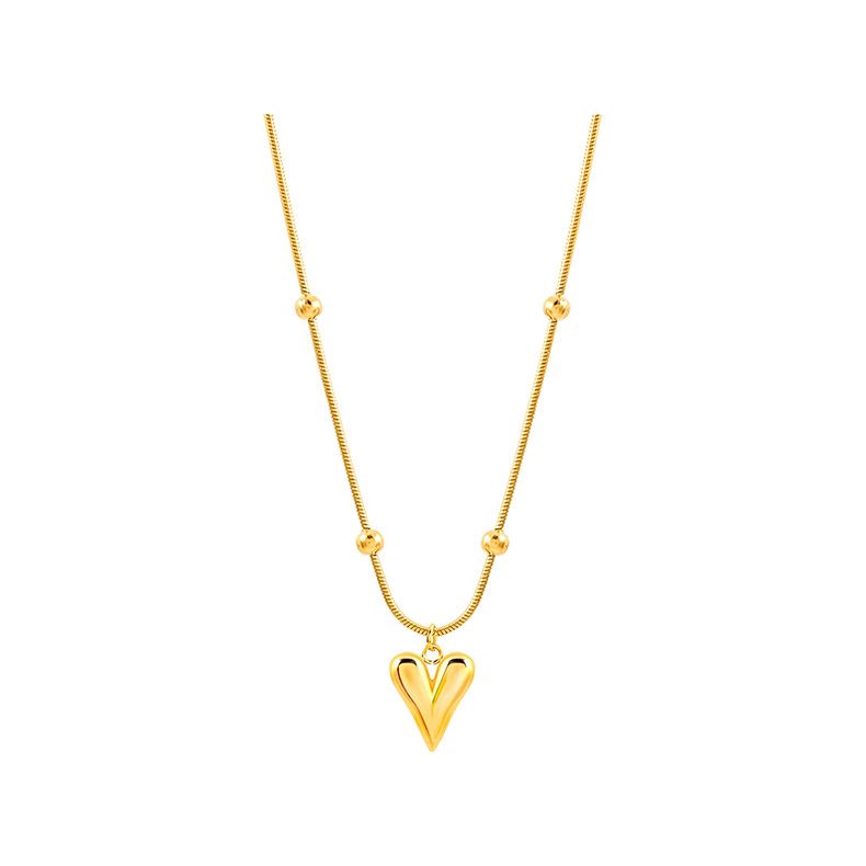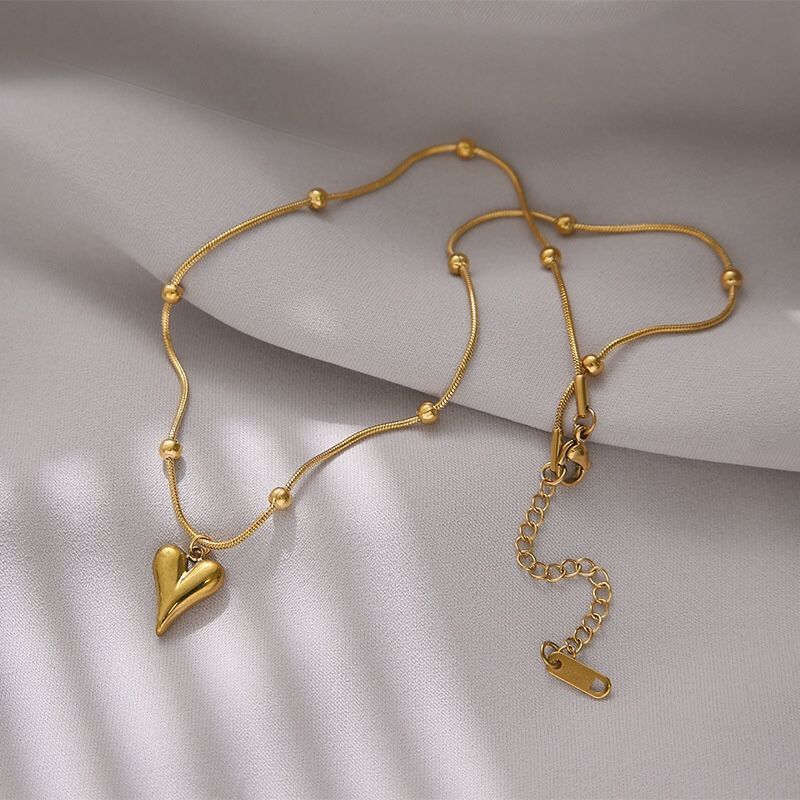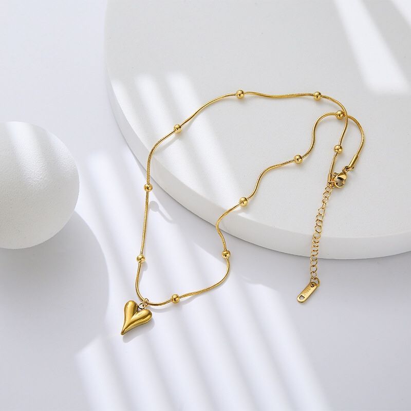 This heart pendant necklace features a refined snake chain paired with delicate bead accents for a modern, elegant look. Designed with a fade-resistant finish, it maintains its shine through everyday wear. The slim collarbone-length chain sits beautifully on the neckline, adding a subtle statement to both casual and dressy outfits. With its lightweight feel and thoughtful detailing, this necklace offers a balance of minimal charm and light luxury style.