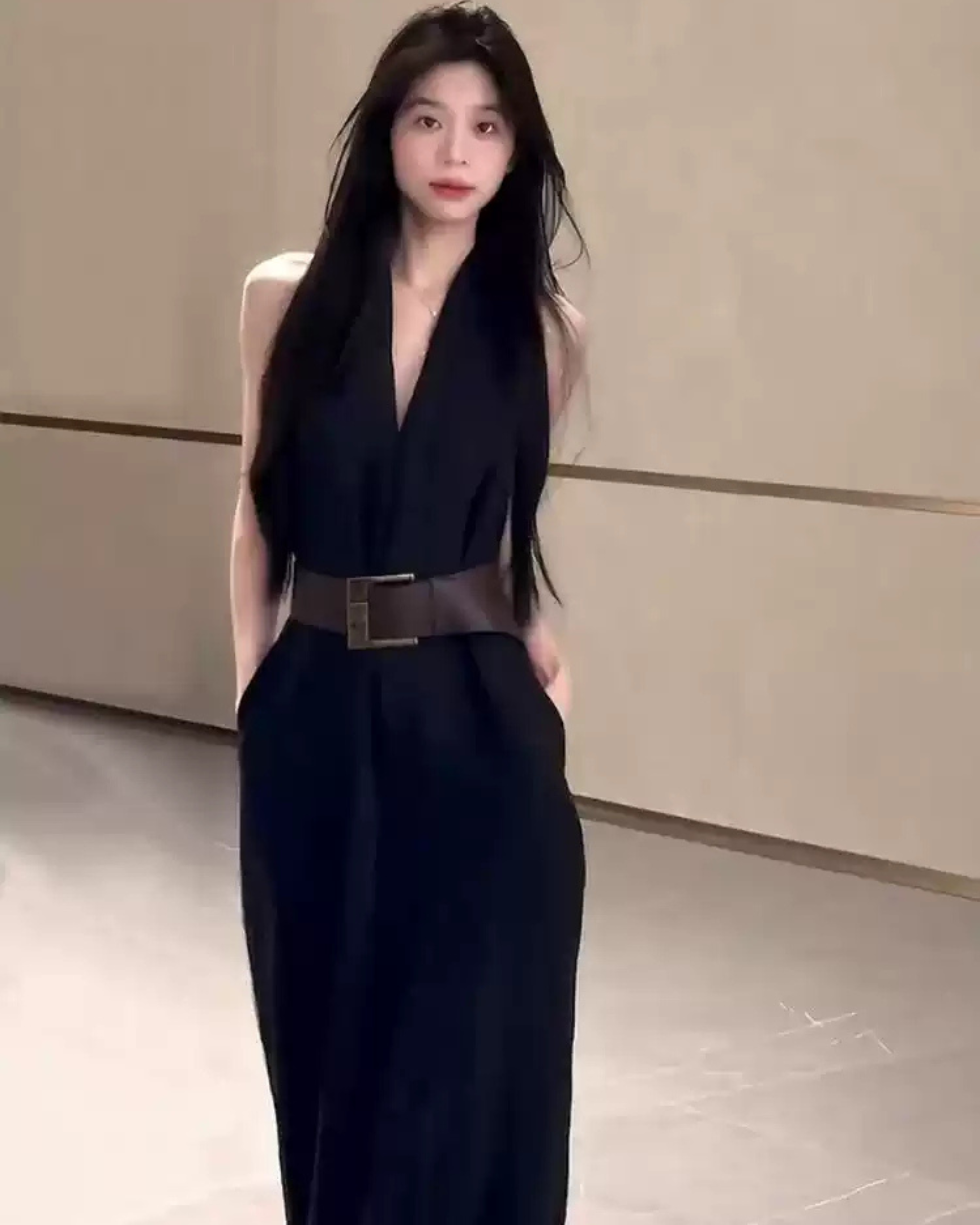 This black V-neck halter neck maxi dress is designed for a sophisticated and mature feminine look. The sleeveless silhouette and slimming cut enhance your natural curves, creating a tall and elegant profile. Crafted for summer comfort, the lightweight fabric flows beautifully, making it ideal for evening events, dates, and chic occasions. The minimalist luxury design gives a modern, high-end feel, perfect for women who love refined and confident fashion. Pair it with heels and delicate accessories for a timeless and graceful look.
