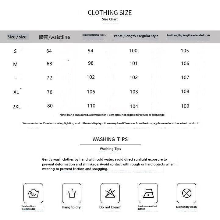| Size | Waist | Hips | Pants Length/Regular | Pants Length/Extra Long |