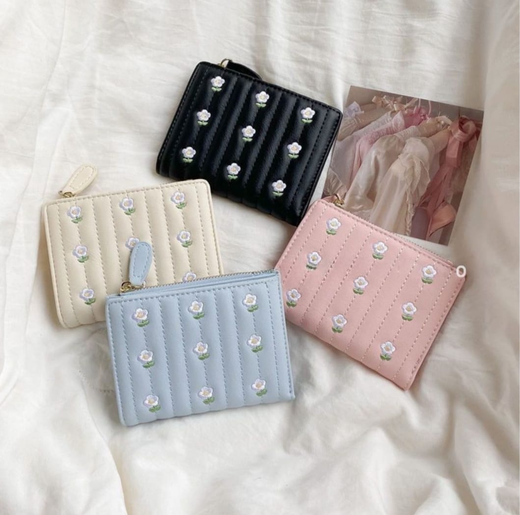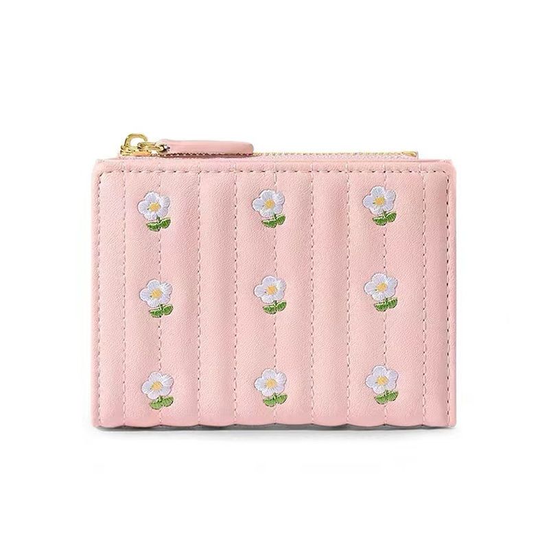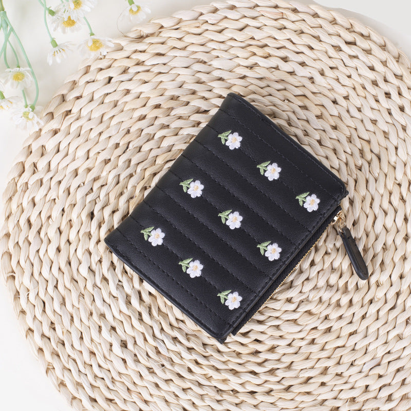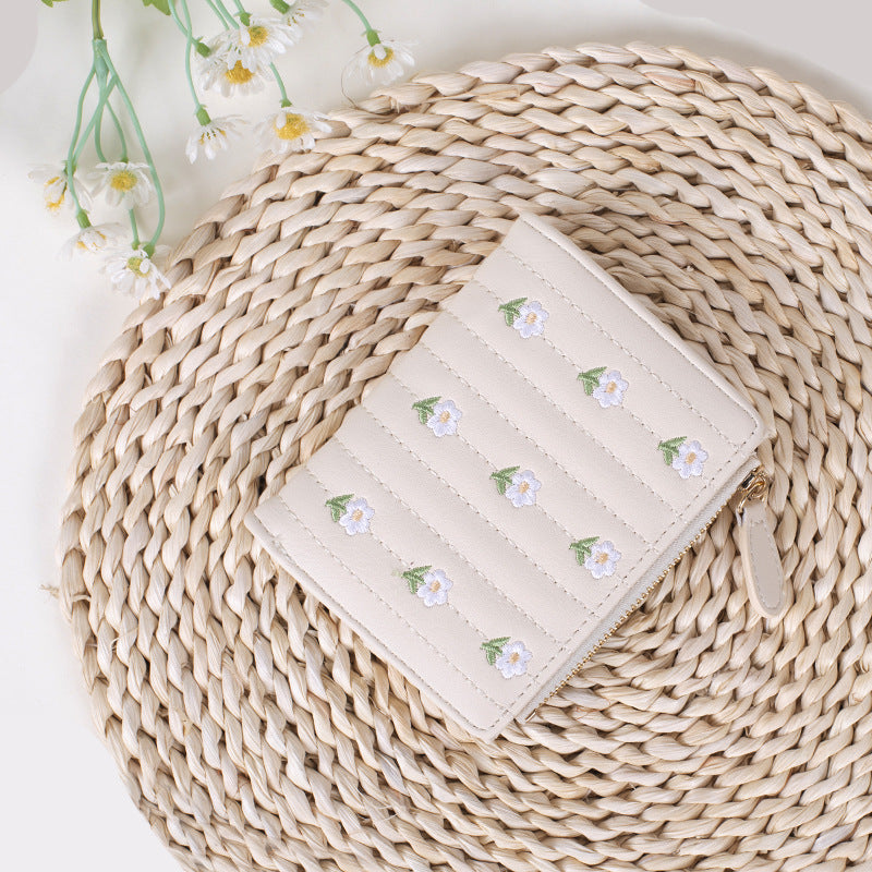 This Embroidered Floral Short Wallet blends softness and charm with its delicate flower embroidery and minimalist design. Compact yet functional, it features multiple card slots and a coin pocket to keep your essentials organized. The smooth texture and gentle pastel tones add a touch of elegance, making it perfect for students and young women who love a fresh, refined style. A sweet everyday accessory that fits easily in your bag while enhancing your look with quiet sophistication.