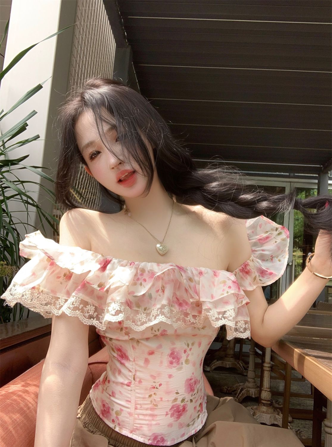 Embrace a soft and romantic vibe with this floral off-shoulder blouse featuring delicate ruffle sleeves and elegant lace trim. Designed with a flattering slim fit and cinched waist, this top enhances your silhouette while offering a graceful, feminine look. The floral print brings a fresh and charming touch, perfect for date nights, casual outings, or daily wear.