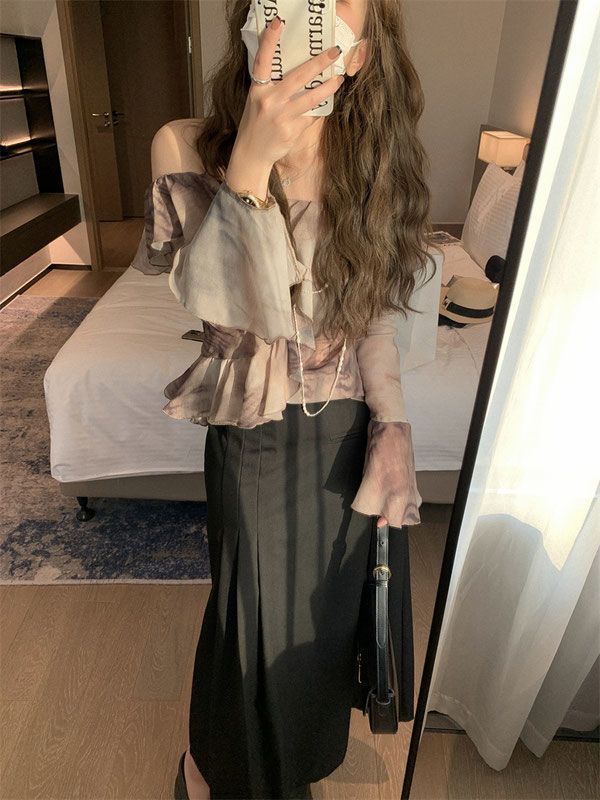This top features a romantic off-shoulder neckline with delicate ruffle details that create a soft, feminine look. The small floral pattern adds a vintage touch, while the cropped silhouette highlights the waist for a flattering style. Light and charming, it pairs easily with skirts, denim, or high-waisted trousers for a fashionable outfit.