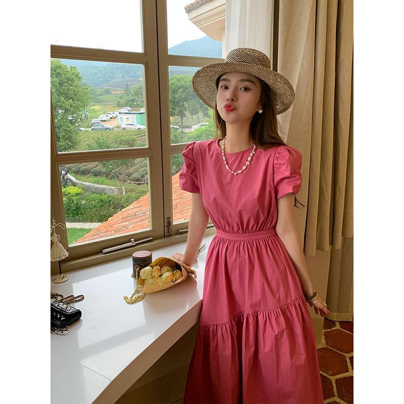 This retro-inspired dress features a slimming waistline and a delicate rose pink color. The round neck and puff sleeves add a touch of femininity, while the long length creates a sleek and sophisticated silhouette. Elevate your style with this elegant and figure-flattering dress.