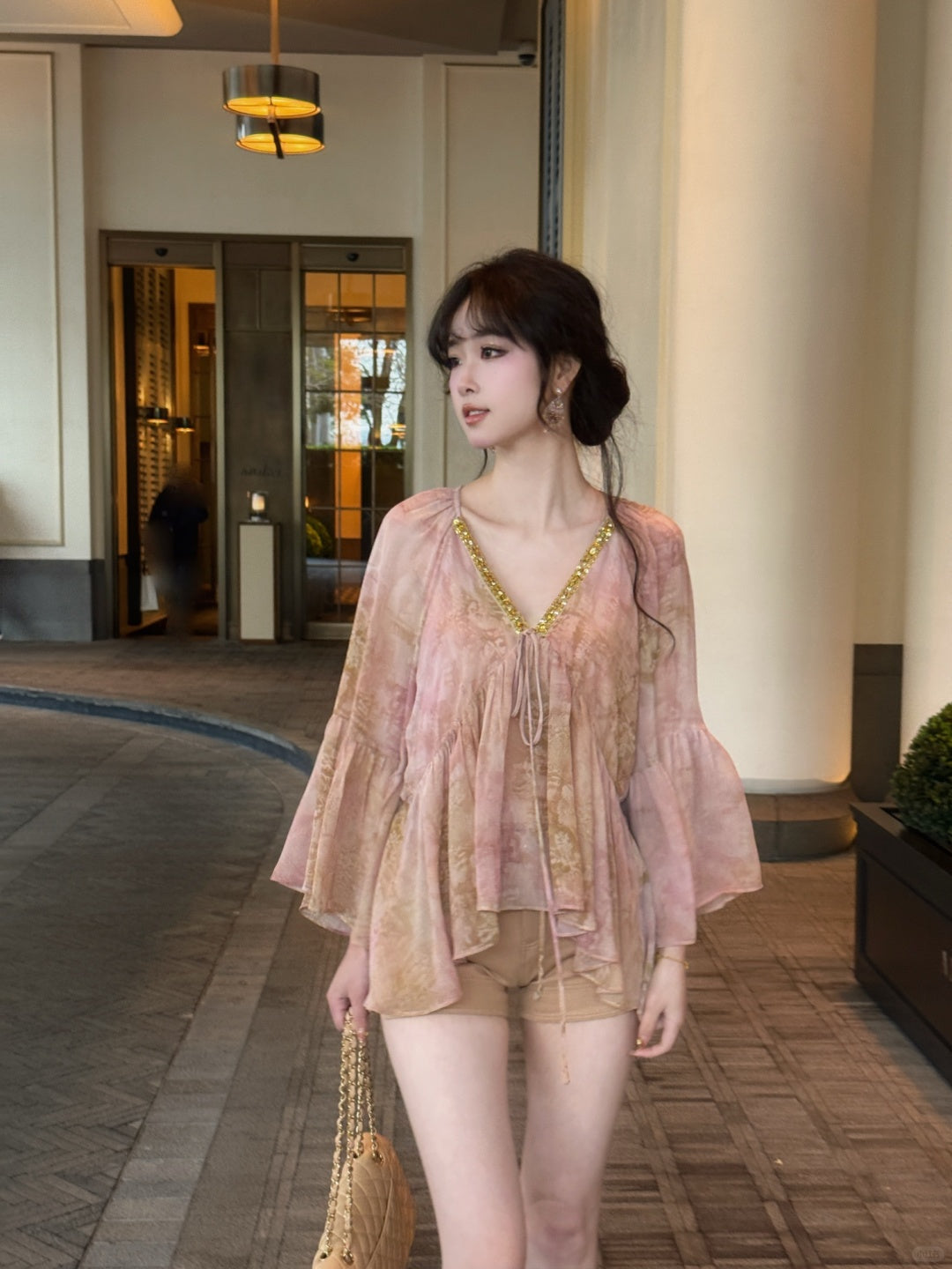 Elevate your wardrobe with this French-inspired V-neck chiffon blouse featuring eye-catching sequin patchwork and flowing long sleeves. The loose, relaxed fit combines comfort with elegance, making it a standout piece for both casual and dressed-up occasions. Designed with refined details and graceful charm, this blouse brings a sense of effortless beauty and uniqueness to any outfit.