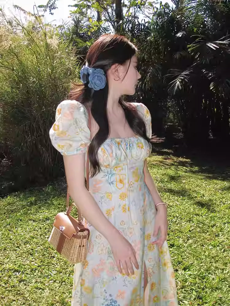 Step into timeless elegance with this French-style floral slit maxi dress, perfect for adding charm to your everyday wardrobe. Designed with soft, flowy fabric and a flattering silhouette, this dress features delicate floral prints and a side slit that adds a touch of sophistication and freedom of movement. Ideal for vacations, brunch dates, or casual outings by the sea, it combines comfort with a refined aesthetic. Pair it with sandals for a laid-back look or dress it up with heels for an effortlessly chic outfit.