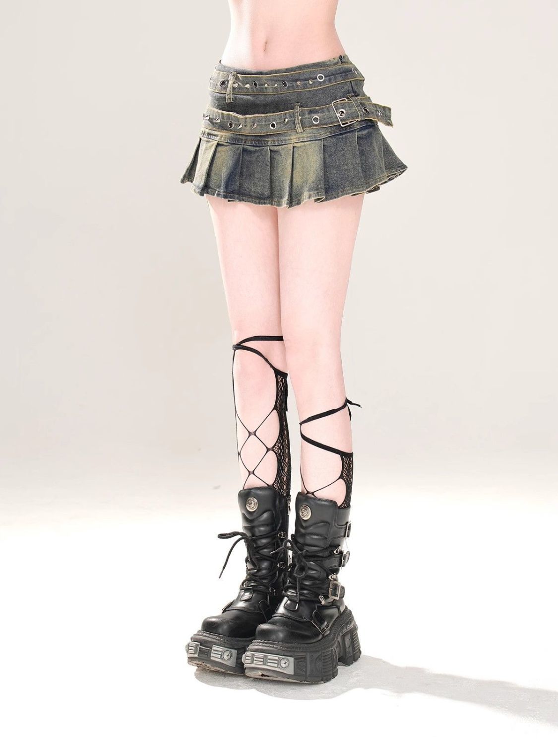 This high waist denim mini skirt is designed with a clean A-line silhouette that visually elongates the legs while enhancing the waistline. The structured pleated design adds movement and a flattering shape, creating a slim and balanced proportion. Crafted from durable denim fabric, it offers a comfortable fit with a crisp, stylish finish. Easy to style with fitted tops or casual tees, this skirt delivers a confident and chic look for everyday wear or street-style outfits.