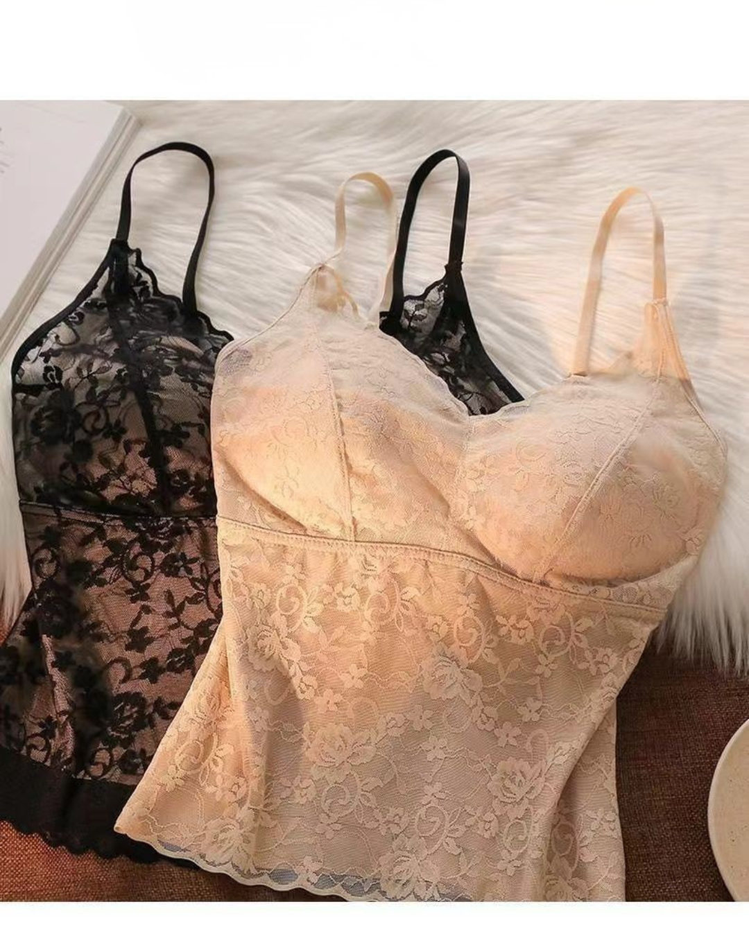 This jacquard lace camisole is designed to highlight elegant curves with a confident and refined touch. Featuring delicate lace texture and a beautifully shaped back design, it enhances the silhouette while offering a slimming visual effect. The built-in padded bra provides light support and comfort, allowing easy wear without extra layers. Versatile and stylish, this camisole works effortlessly as an inner layer or a standalone top, adding a graceful yet modern charm to any outfit.