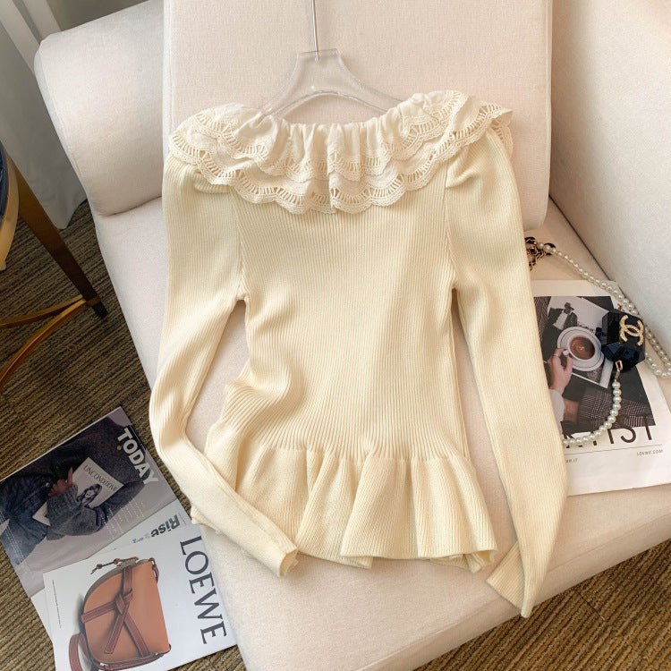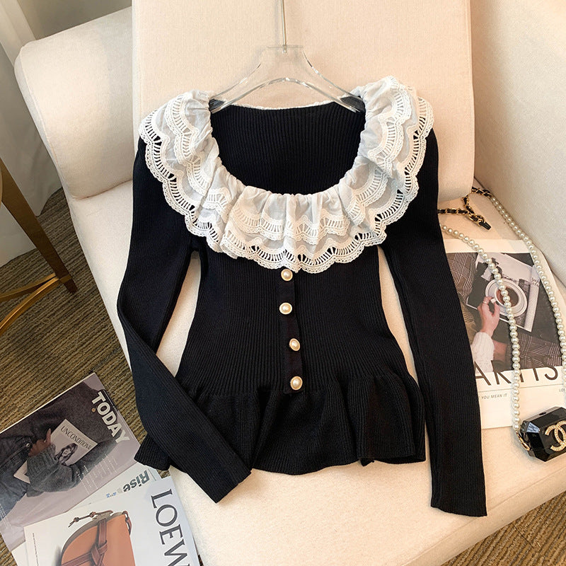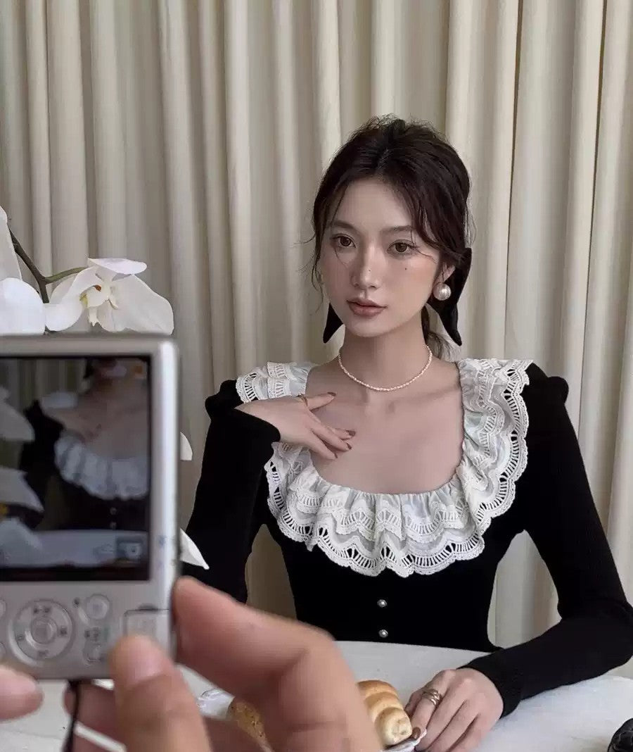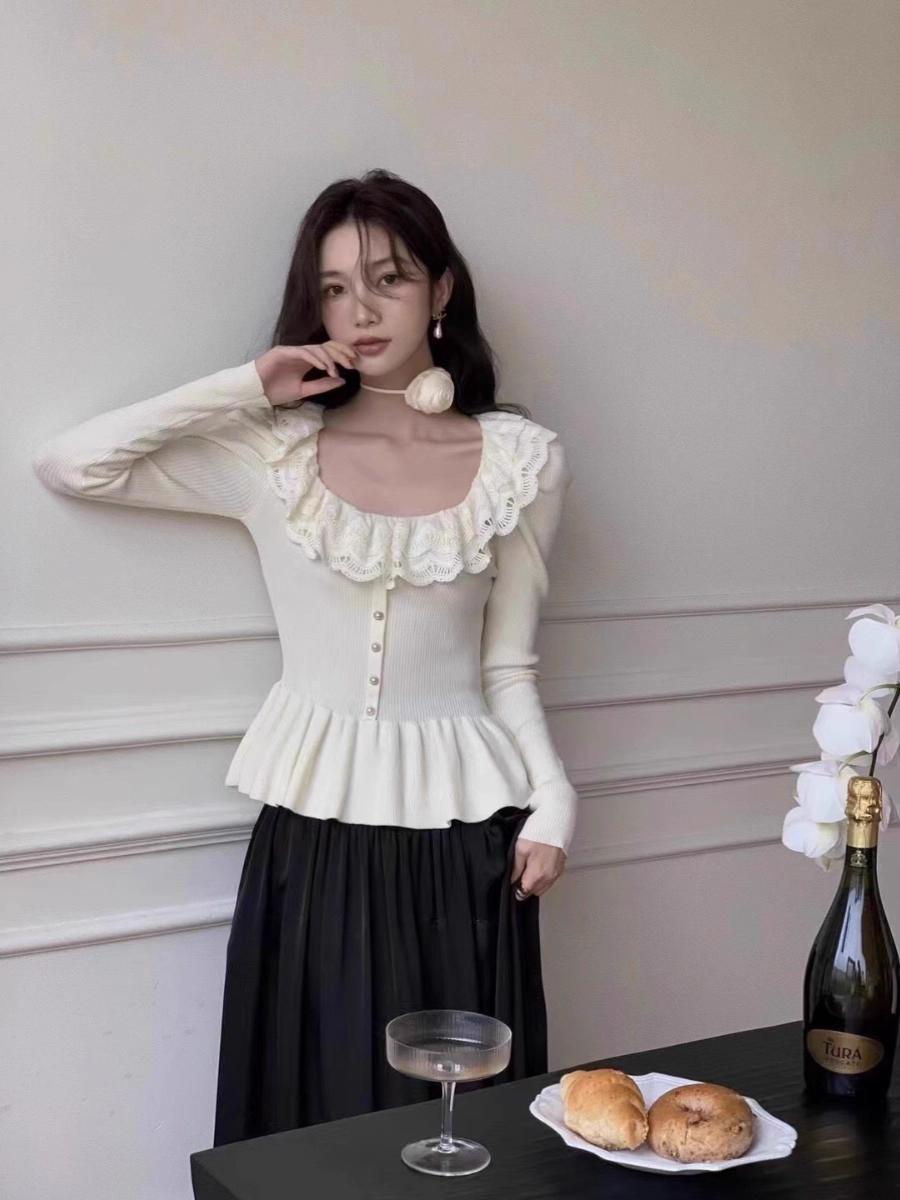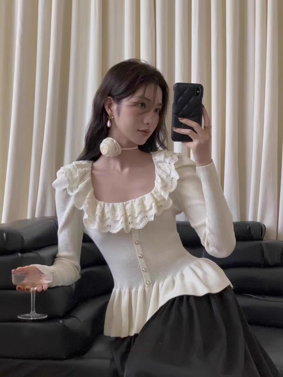 This Korean-style contrast color sweater blends French elegance with modern charm. Featuring delicate ruffle details and dainty buttons, it exudes a soft and feminine aura. The slim-fit design flatters the figure while maintaining comfort, making it perfect for both casual and refined looks. Crafted from smooth, lightweight knit fabric, it adds a touch of sophistication to any outfit. Pair it with skirts or tailored pants for a graceful, effortlessly chic appearance that captures the essence of gentle, romantic style.