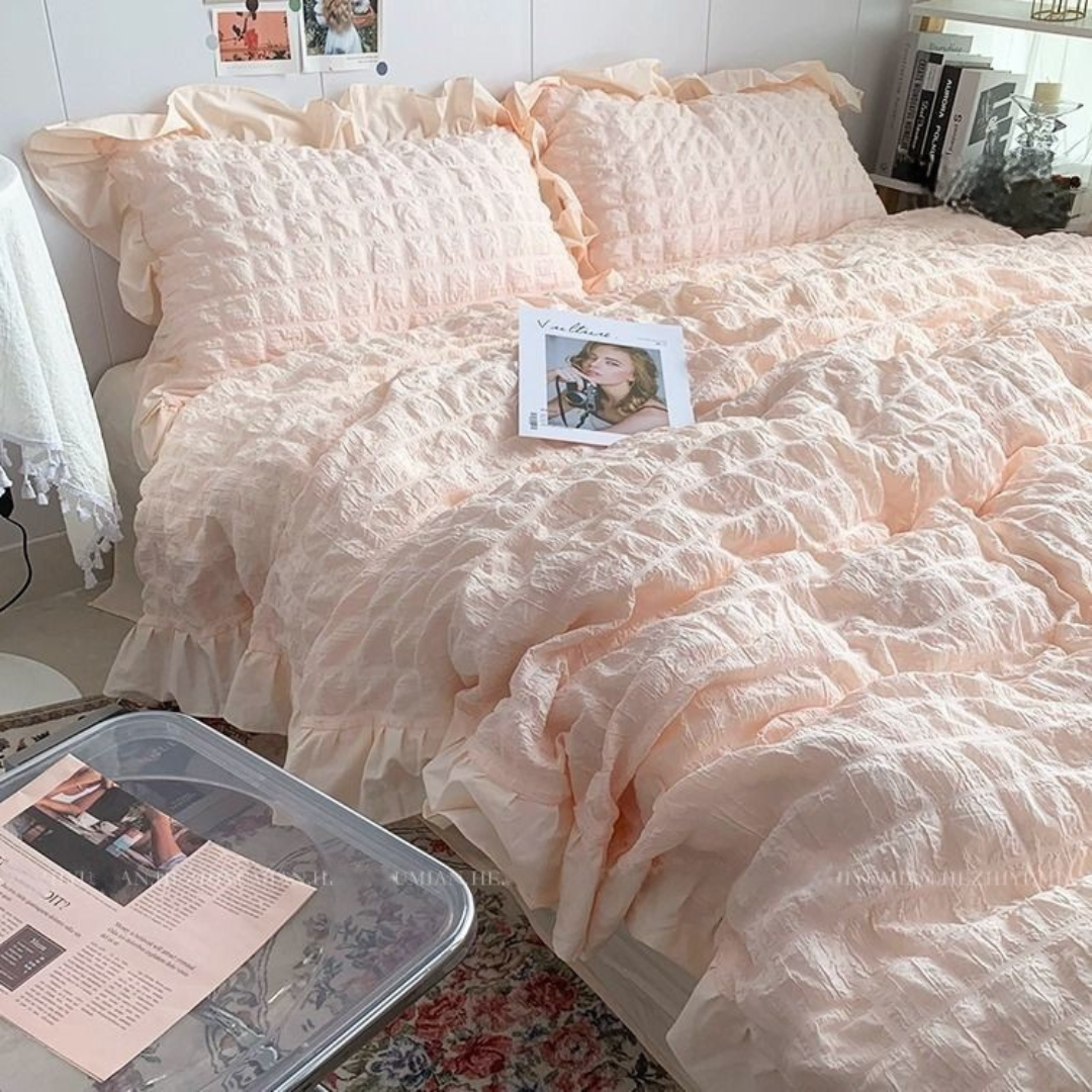 Upgrade your sleep space with this Korean-style minimalist bedding set. Crafted from ultra-soft, breathable fabric, this set features solid pastel colors and elegant puffed lace trim. Whether you're outfitting a college dorm or creating a calm and cozy bedroom, this set brings comfort and effortless style in one package.