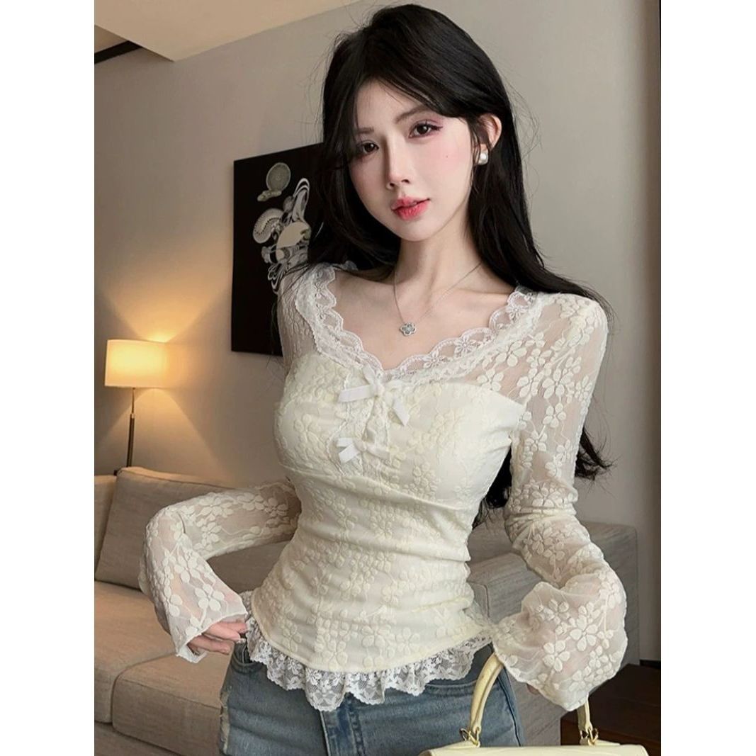 This lace long-sleeve blouse blends sweetness with elegance, featuring a delicate bow and a slim-fit waist for a flattering silhouette. Soft and lightweight, it’s perfect as a chic base layer or worn alone for a graceful look. A versatile piece to elevate your everyday style.