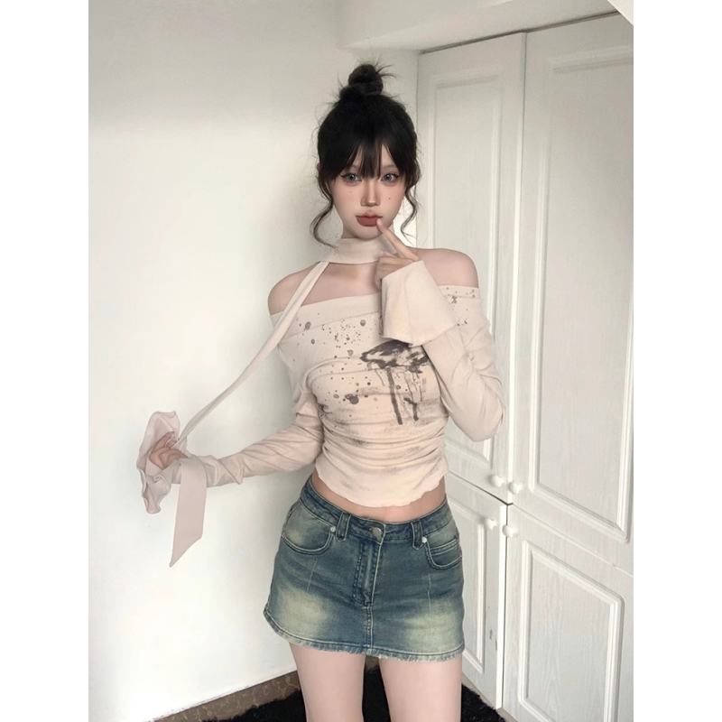 Elevate your style with this Maillard-inspired off-shoulder crop top. Designed with soft long sleeves and vintage ribbon details, it highlights a slim silhouette with a pure desire charm. Perfect for pairing with skirts or jeans, this chic top balances elegance and bold femininity, making it a must-have for modern trendsetters.
