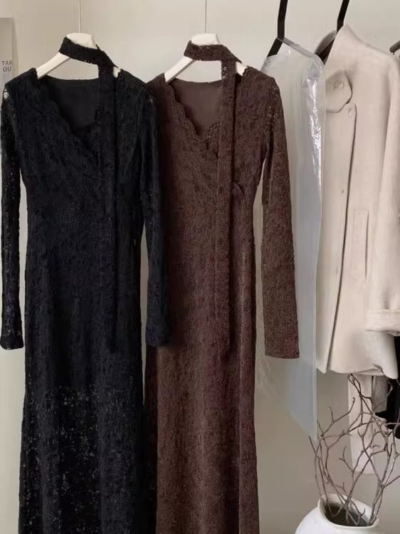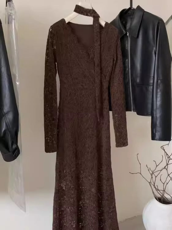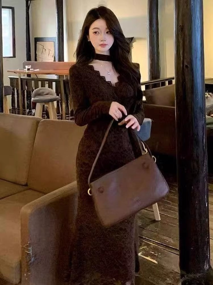 Elevate your autumn and winter wardrobe with this elegant Maillard style mermaid lace dress. Designed with long sleeves and a flattering fishtail silhouette, it enhances your curves while offering a refined and sophisticated look. The delicate lace fabric adds a touch of luxury, making it perfect for formal events, evening parties, and stylish daily wear. A versatile base dress that pairs beautifully with heels and coats for a timeless, graceful outfit.