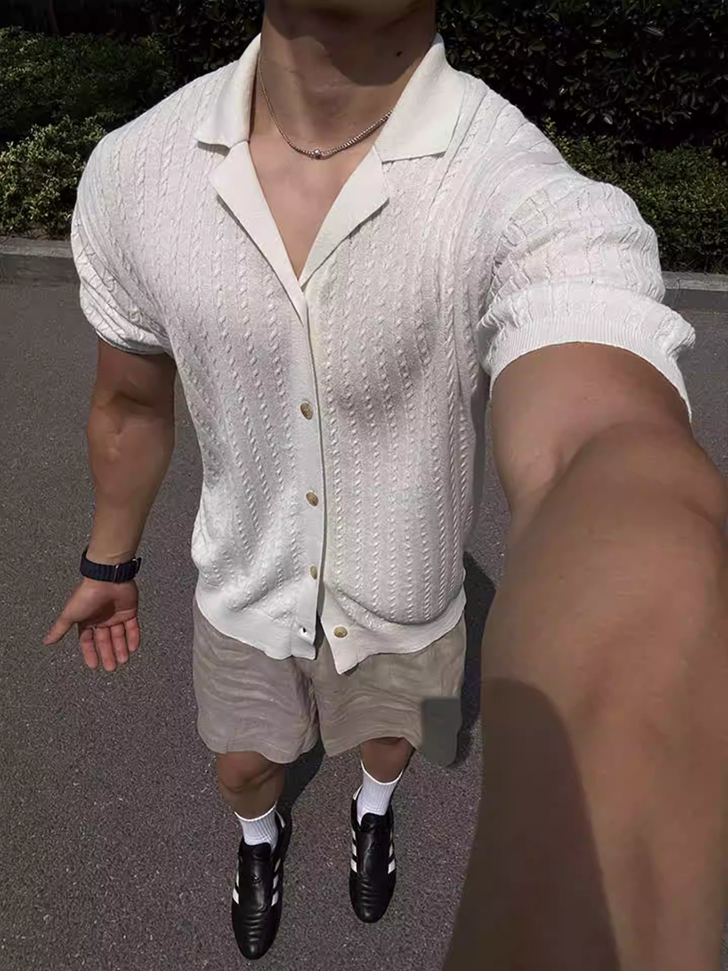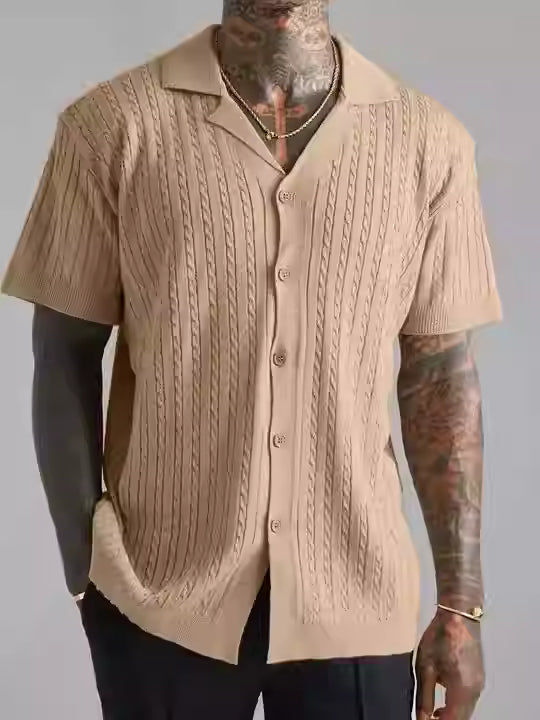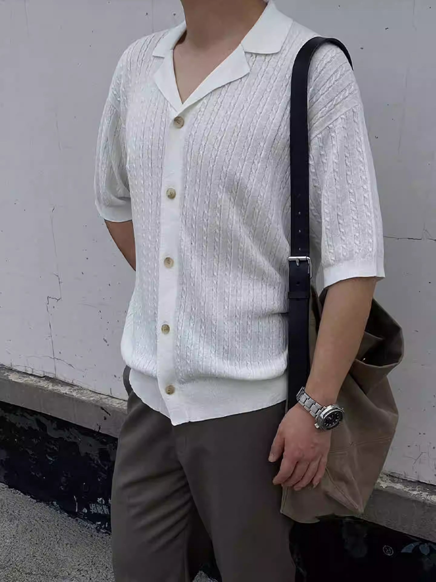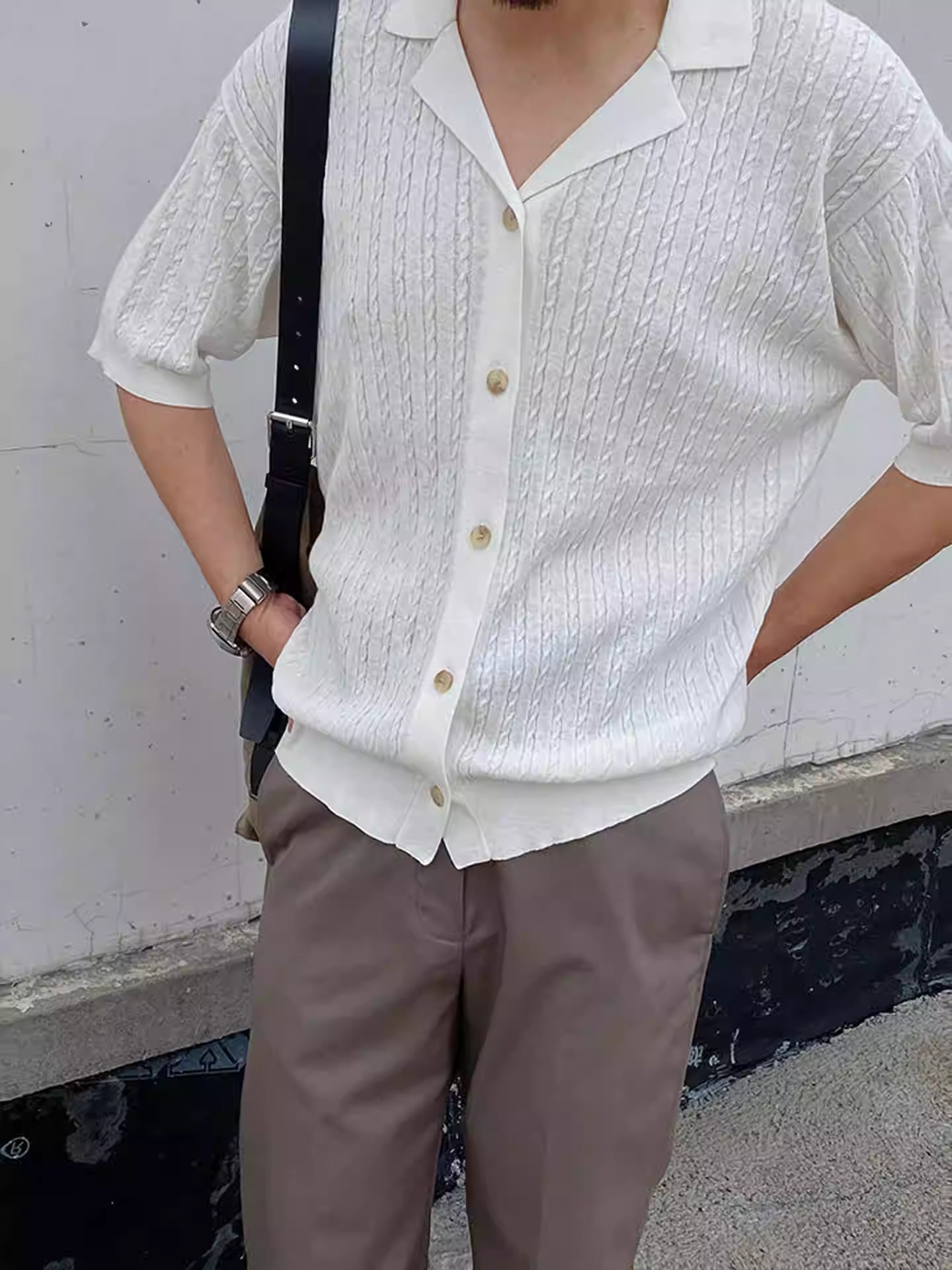 This men’s ice silk knitted short sleeve top features a lightweight and breathable fabric for a cool summer feel. Designed in a minimalist Korean and British-inspired style, it offers a relaxed yet refined look. Perfect as a base layer or casual cardigan-style T-shirt, it pairs easily with jeans or trousers for a modern, versatile outfit.