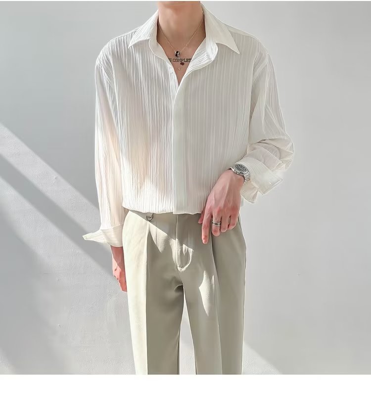 This men’s loose fit shirt showcases a unique wrinkle texture and smooth drape for a relaxed, stylish look. Crafted from soft, wrinkle-resistant fabric, it stays fresh and comfortable throughout the day. The minimalist Korean-style design offers effortless versatility—perfect for casual outings or smart everyday wear. Pair it with jeans or trousers for a clean, modern appearance with a touch of laid-back charm.