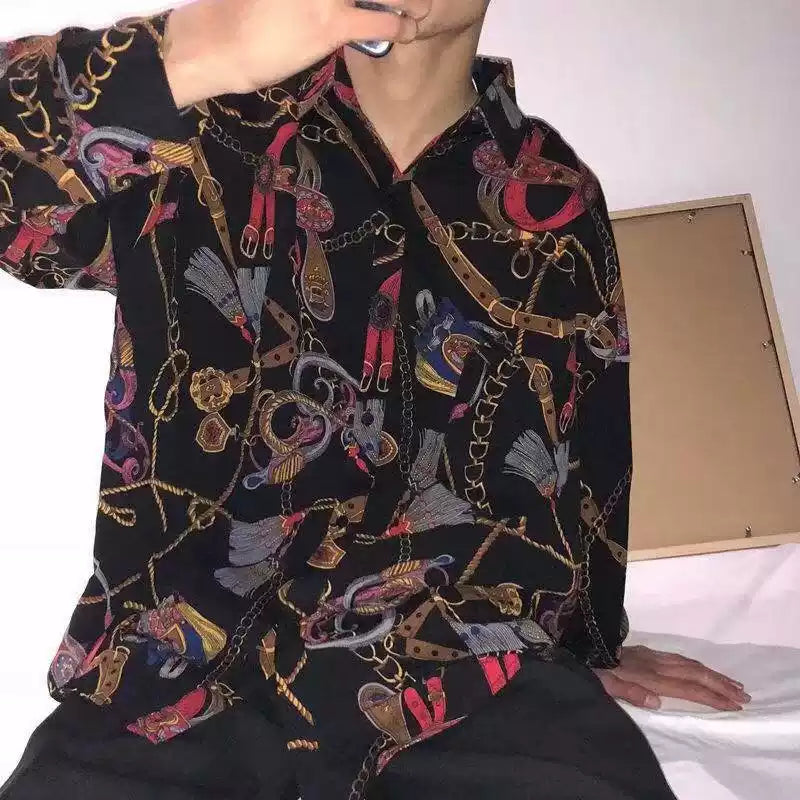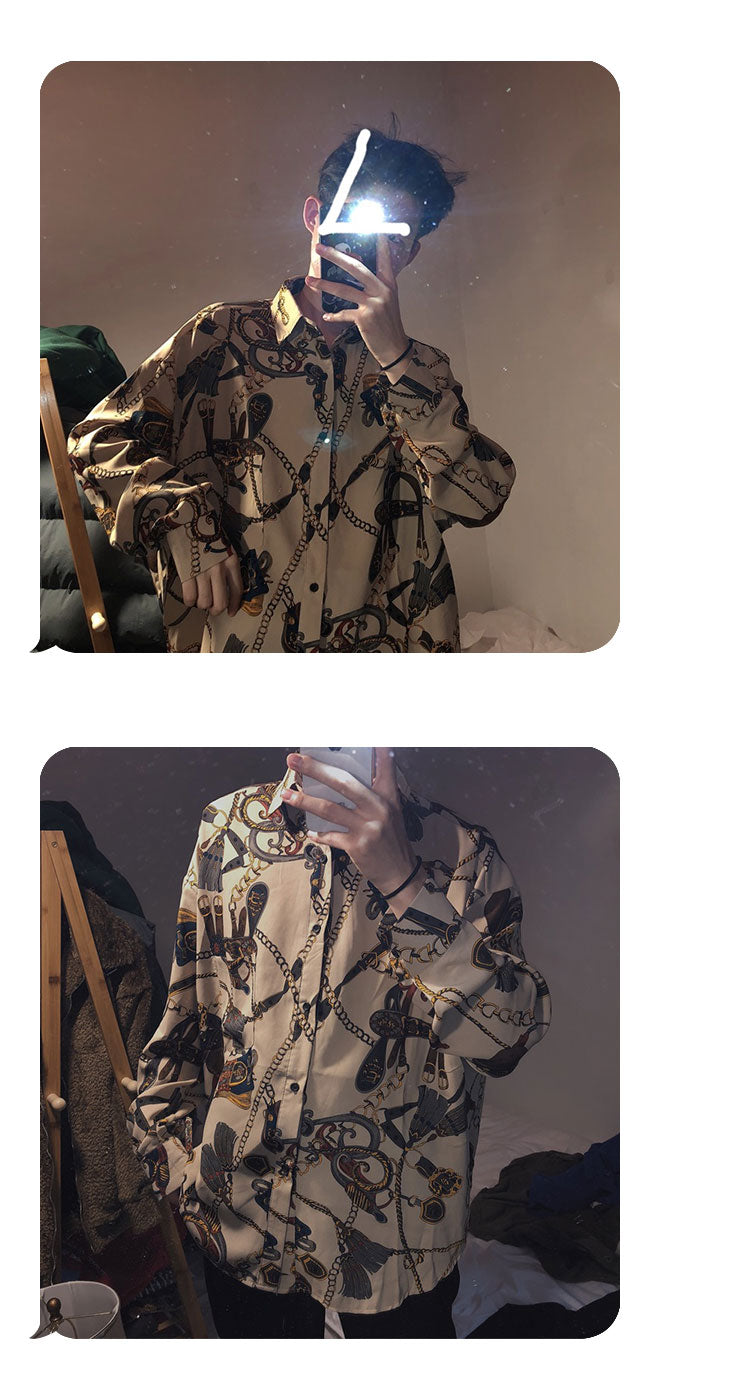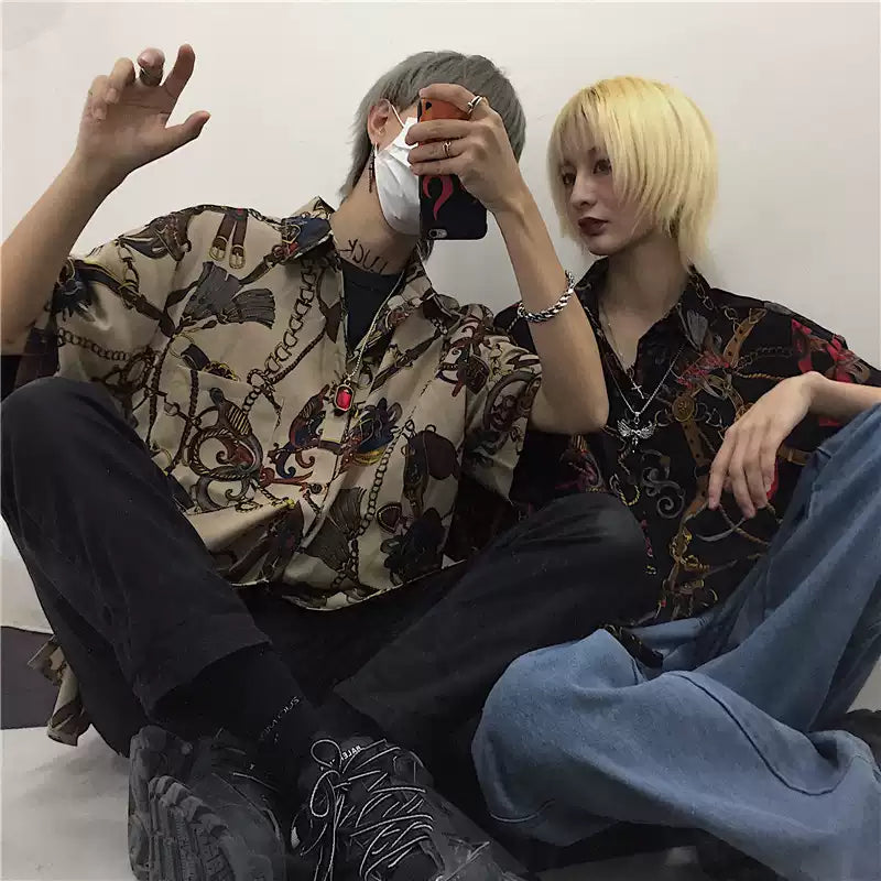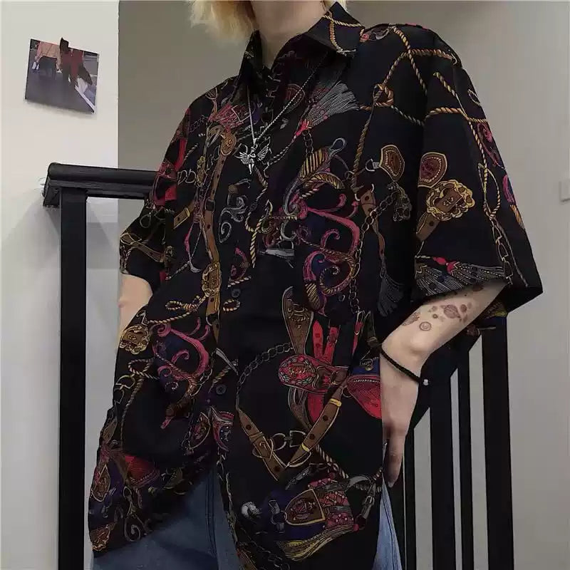 Make a bold statement with this men’s vintage-inspired chain print short sleeve shirt, blending Hong Kong street style with subtle Japanese casual aesthetics. Designed with a relaxed fit and five-point sleeves, it offers a unique silhouette that's comfortable and easy to wear.