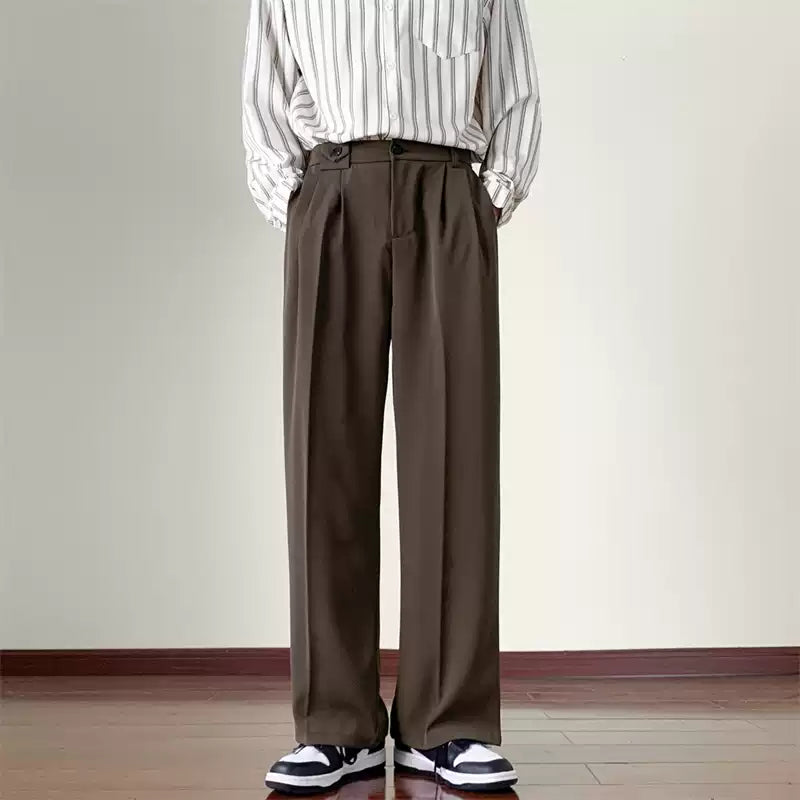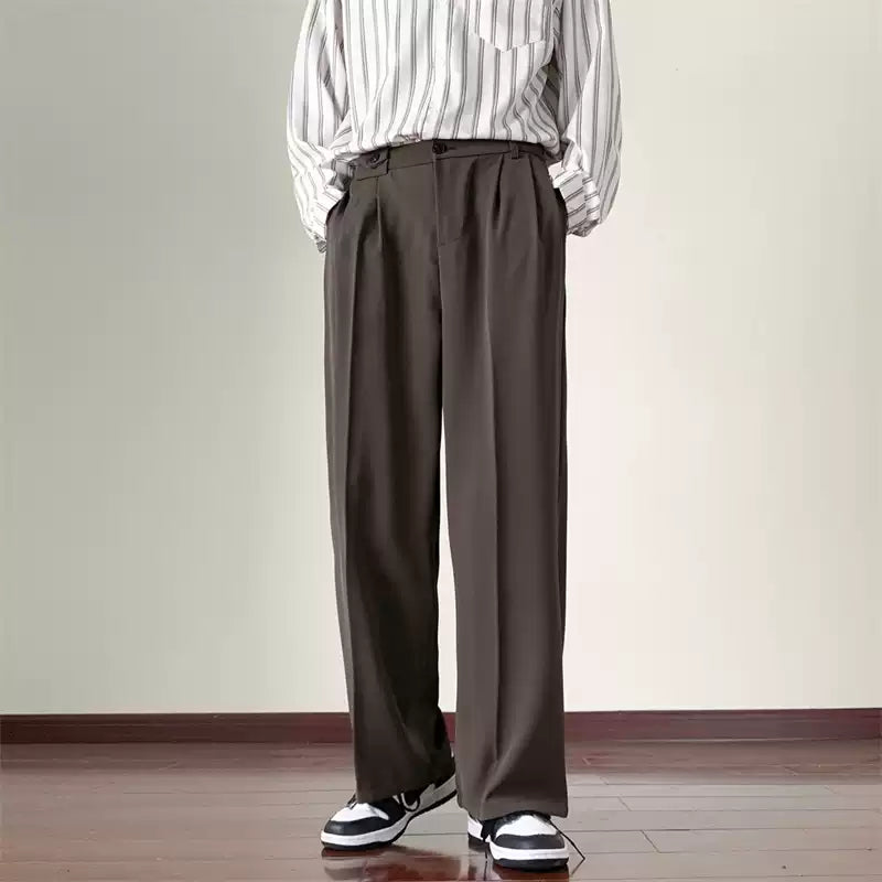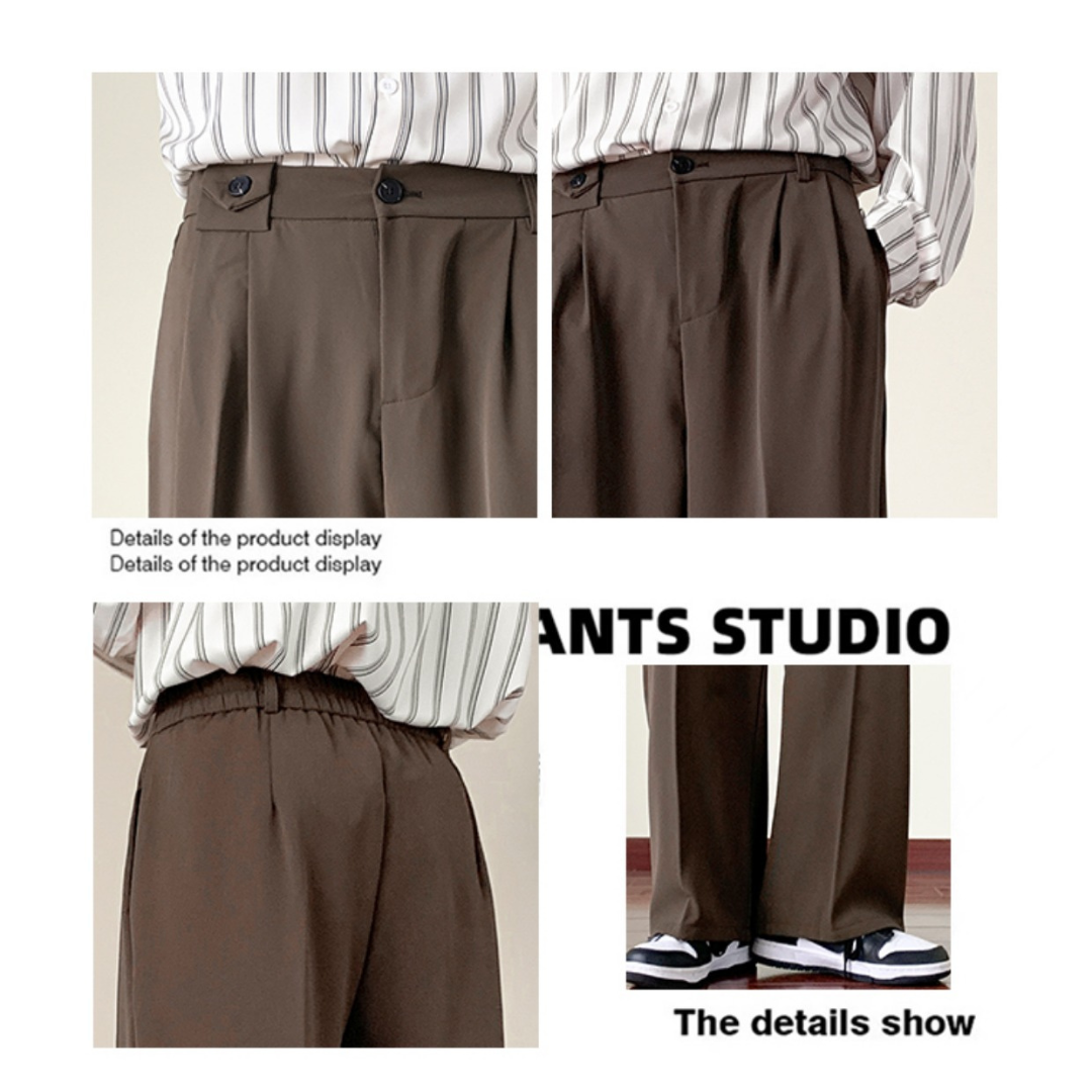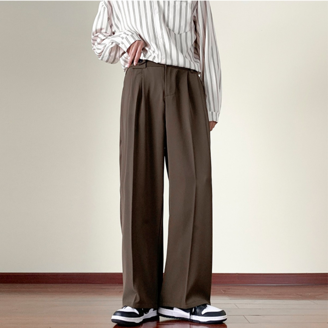 Upgrade your streetwear game with these Hong Kong-style straight-leg suit pants for men. Blending Korean fashion trends with a clean, modern silhouette, these trousers feature a sleek drape, structured fit, and subtle tailored details that elevate your everyday look.