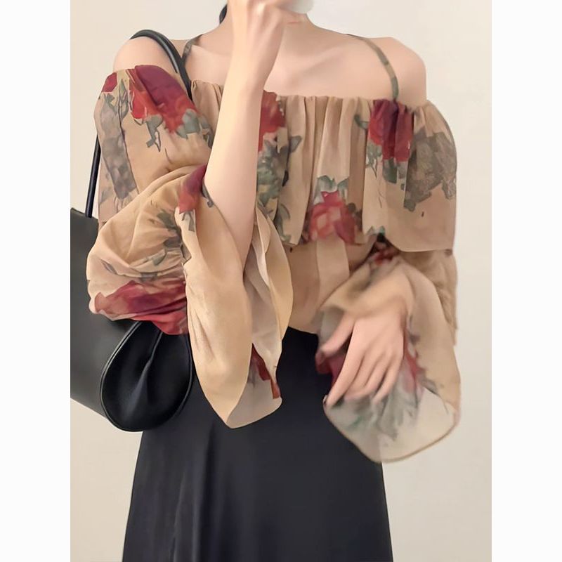This printed chiffon top features a one-line collar and off-shoulder design for a chic and slimming look. With its loose fit and trumpet sleeves, it offers a comfortable and stylish option for any occasion. Elevate your wardrobe with this must-have piece.