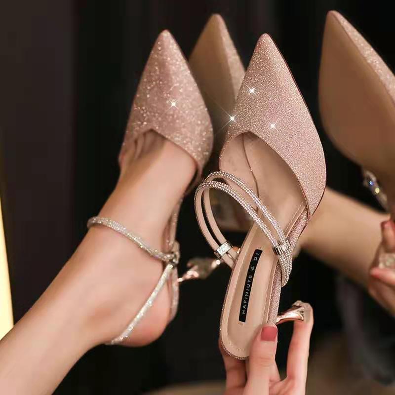 Chic pointed-toe mules featuring a sparkling rhinestone strap and elegant slim heel design. The two-way wear option allows effortless switching between mule and closed-toe style for versatile looks. Comfortable small-height heel adds graceful lift, while the secure fit keeps every step stable. Perfect for pairing with dresses, trousers, or skirts for daily elegance and understated glamour.