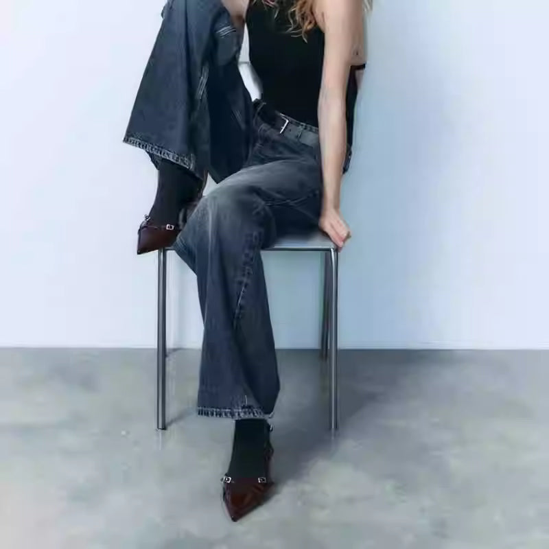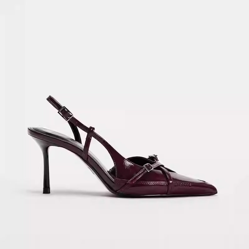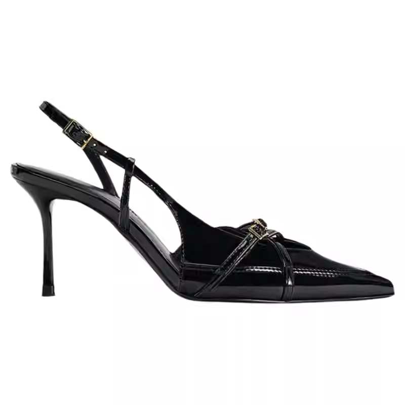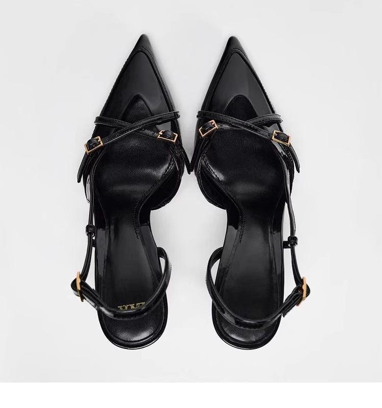 These pointed-toe mule heels feature delicate slim straps and a minimal single buckle design that creates a refined, feminine silhouette. The elevated heel adds graceful height, while the clean lines keep the look elegant and easy to style. A versatile pair that enhances both casual and dressy outfits with effortless charm.