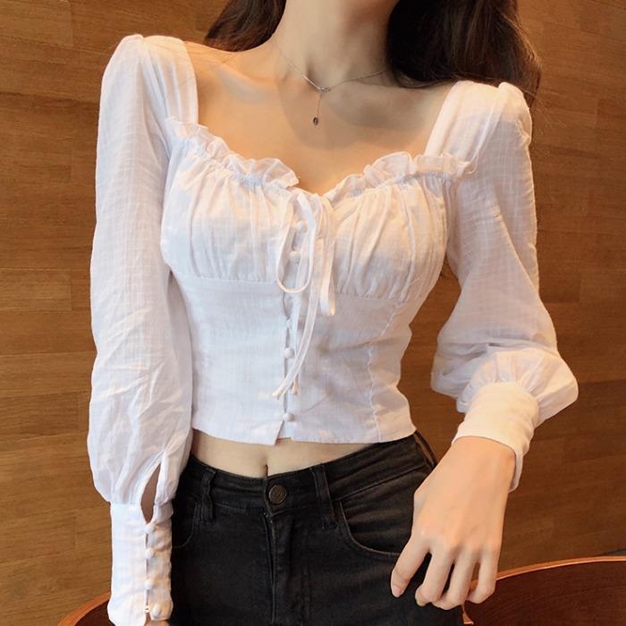 This Spring square collar top features an exposed collarbone and puff sleeves, creating a stylish and trendy look. The cropped design is complemented by a lace-up detail, adding a touch of femininity. Made with solid color fabric, this top is perfect for adding a pop of color to your wardrobe.