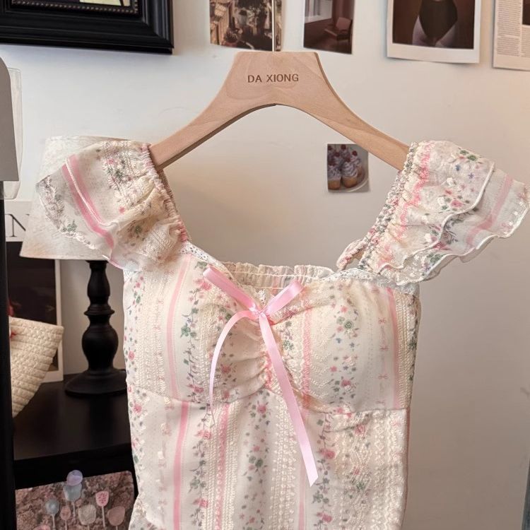 Embrace sweet vibes with this ruffle-trimmed puff sleeve shirt featuring a flattering square neckline and delicate floral print. The slim fit and tie-up detail add a charming touch, making it a trendy and versatile top for any casual occasion.