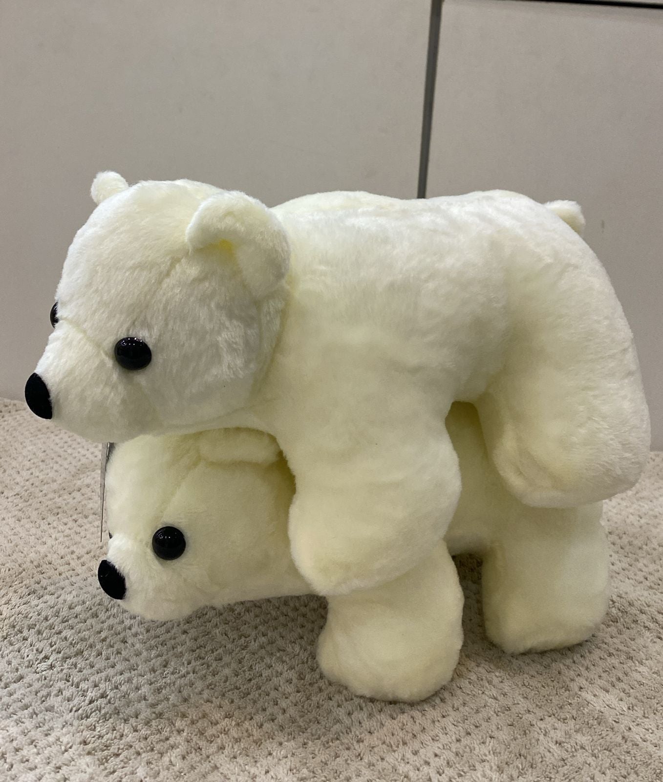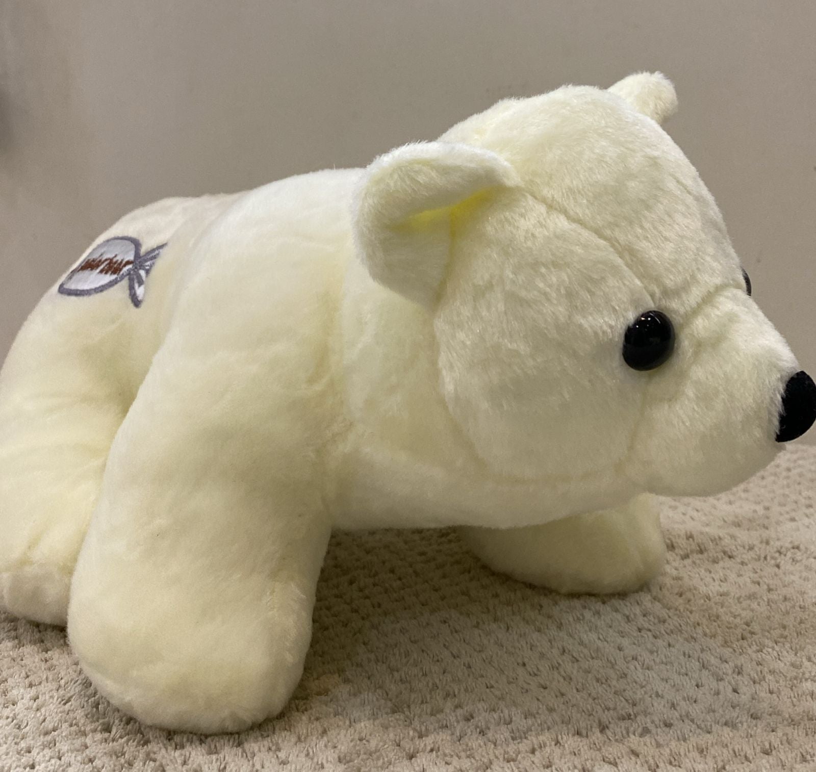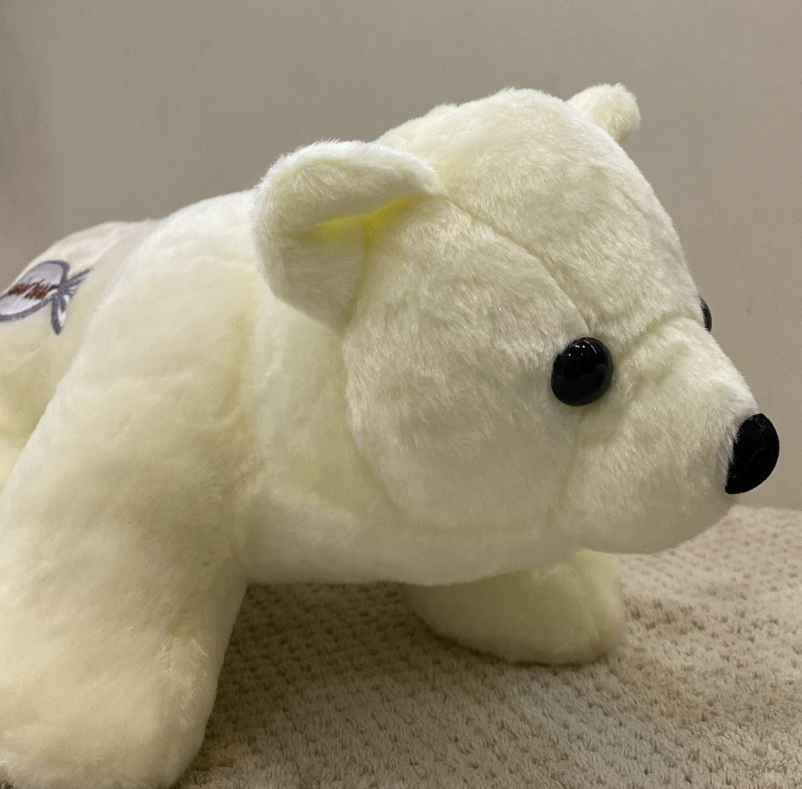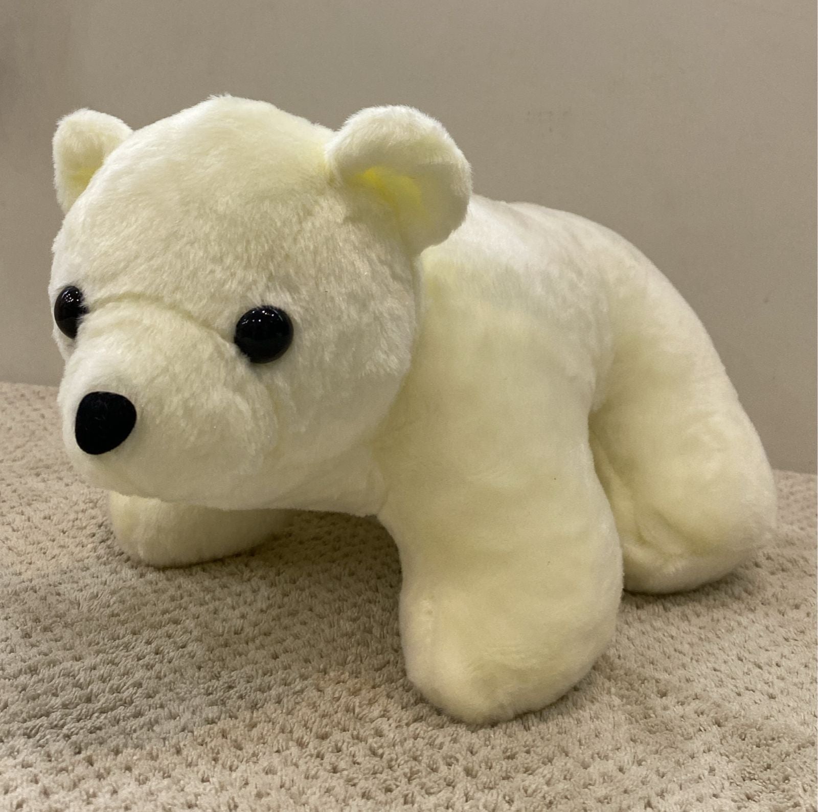 This soft and cuddly white polar bear stuffed animal is the perfect companion for playtime or decoration. Crafted from plush material, this toy offers a gentle touch and durable design. The detailed black eyes and nose give it a realistic and charming appeal. Ideal for animal lovers of all ages, this plush toy is a simple and timeless addition to any collection.