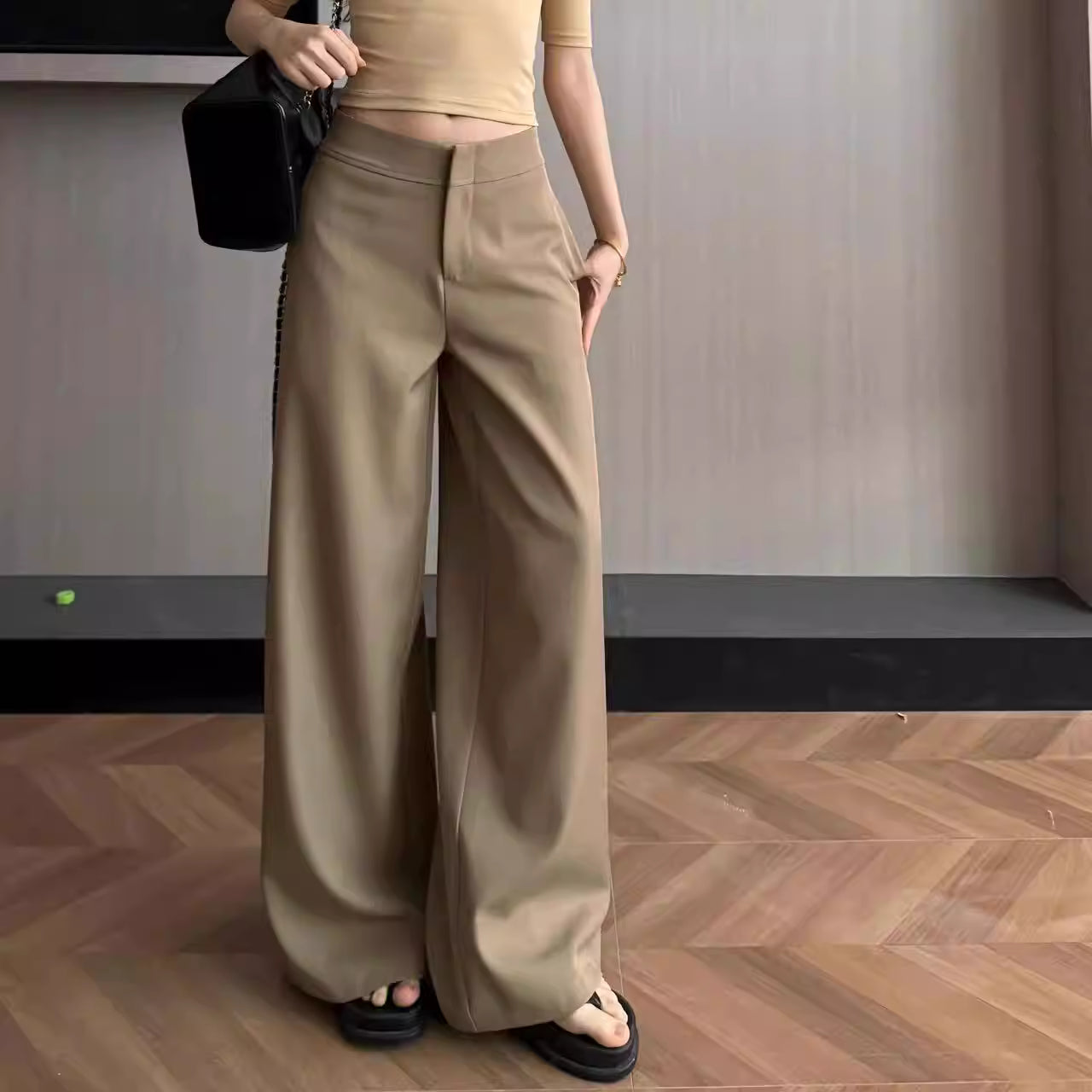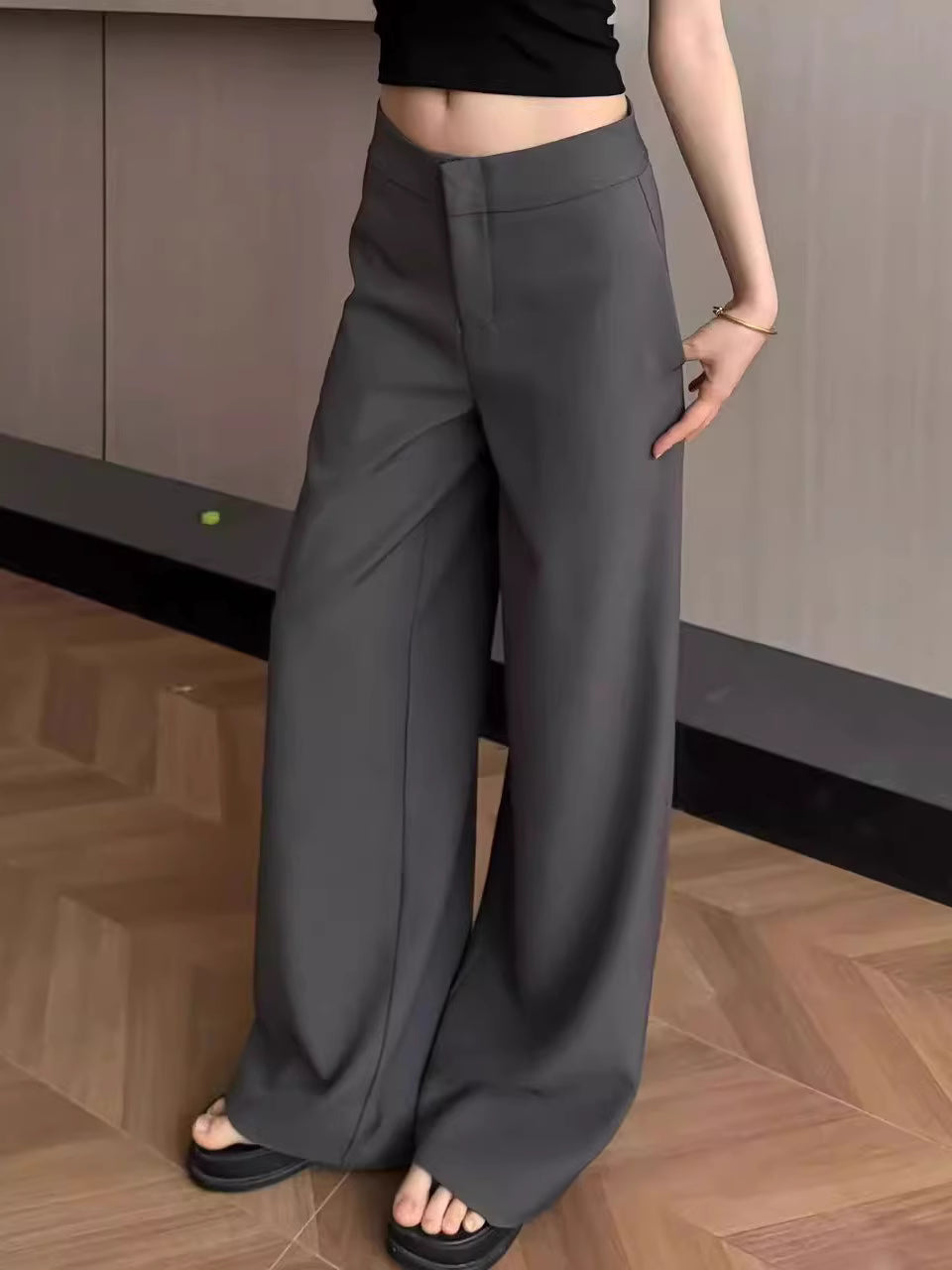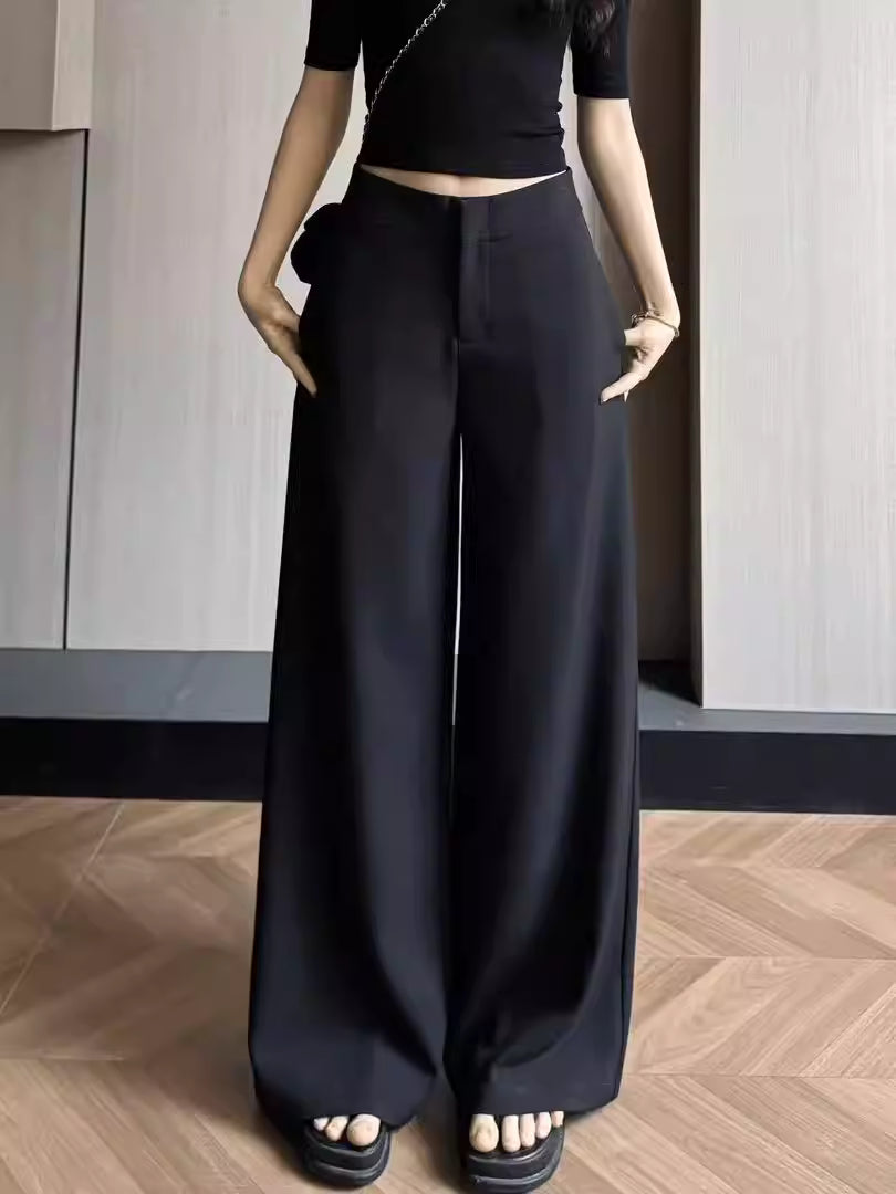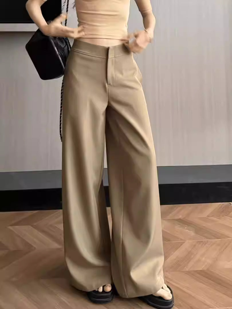 These low-rise tailored trousers feature a clean straight cut with a wide-leg silhouette for a relaxed yet polished look. The structured fabric drapes smoothly, creating a refined appearance that balances comfort and style. Designed for easy everyday wear, the straight wide-leg shape flatters the legs and offers effortless movement. Versatile and understated, these trousers pair well with knit tops, shirts, or blazers, making them a timeless wardrobe staple with a modern, elegant edge.
