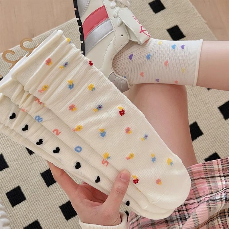 These women's socks feature a Japanese-inspired design with colorful polka dots that add a playful touch to any outfit. Made with a thin pile for a comfortable fit, these mid-tube socks are both stylish and practical. Perfect for adding a pop of color to your wardrobe.