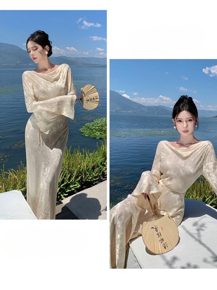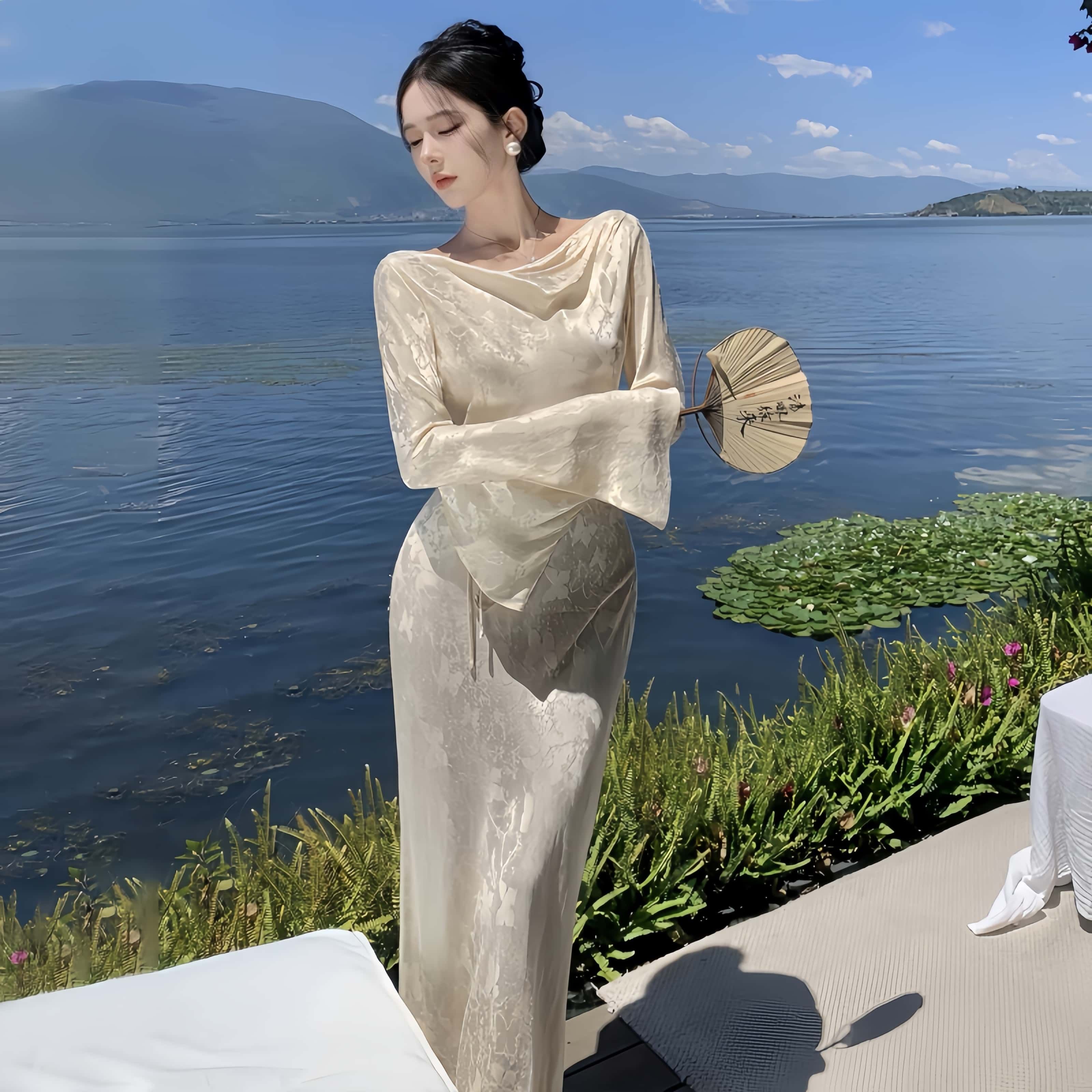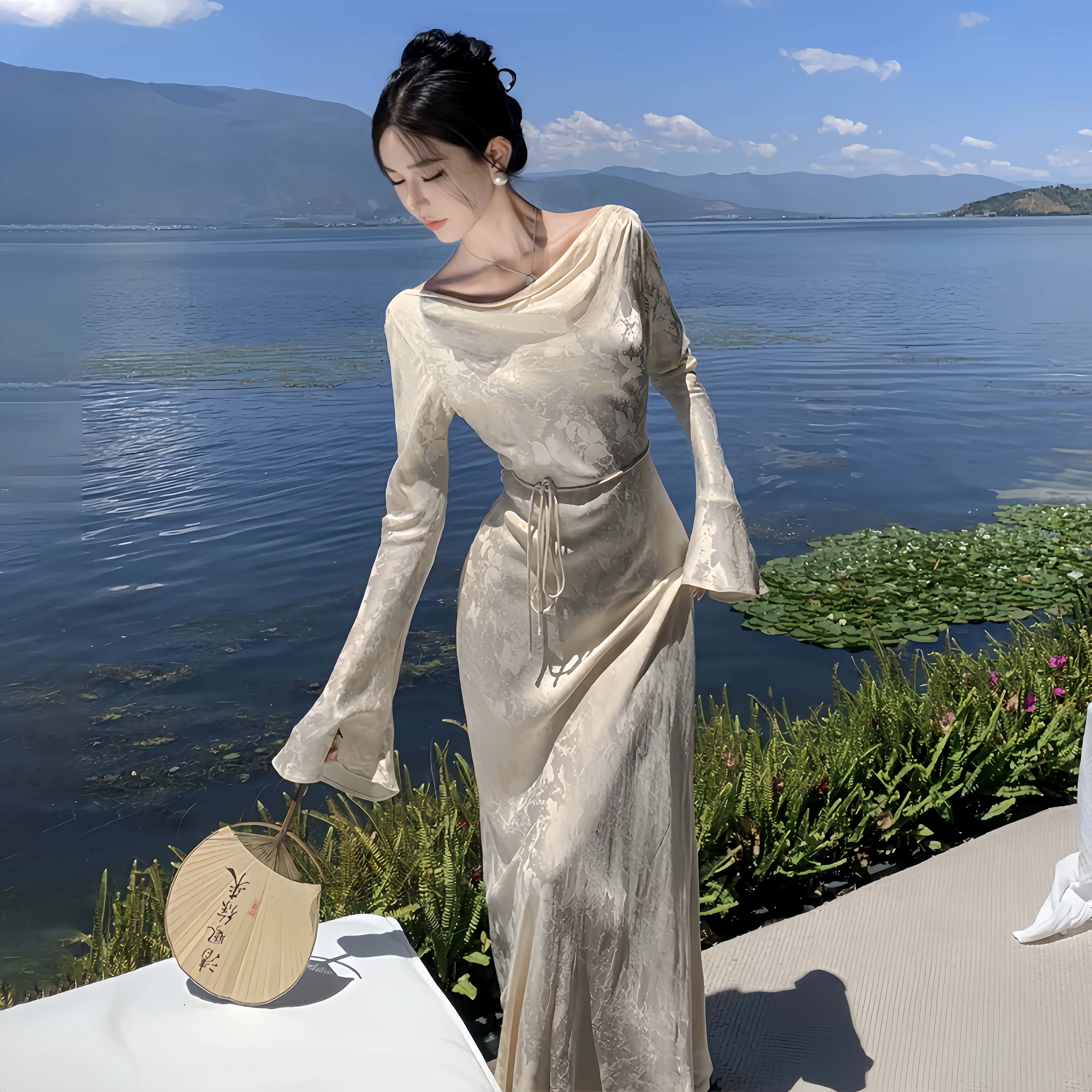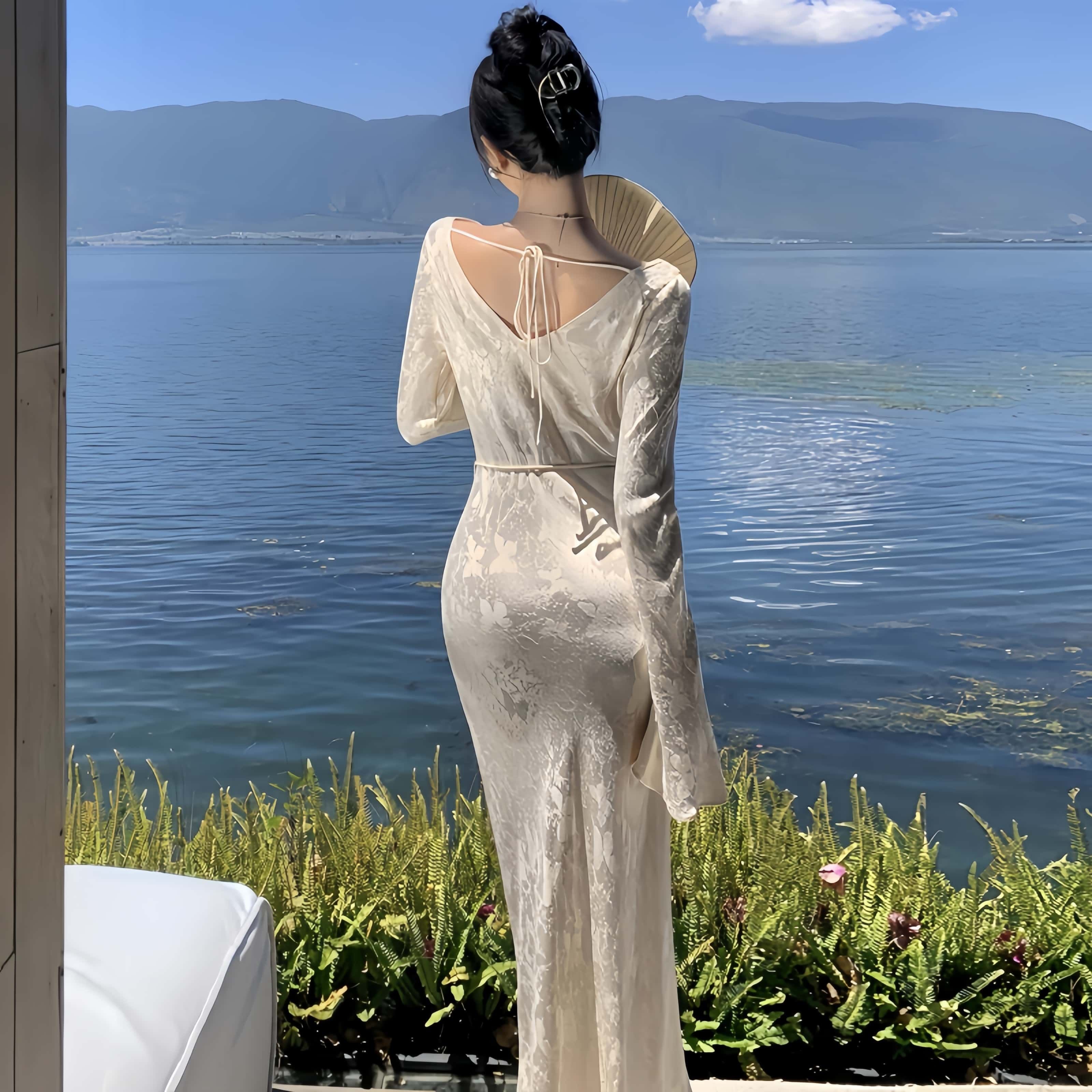 This modern Chinese-inspired long-sleeve dress features a smooth, draped fabric that enhances natural movement and creates an elegant silhouette. The bodycon fit highlights the figure while maintaining a refined, understated style. Designed with a blend of Eastern elements and contemporary French aesthetics, this dress offers a unique boutique look suitable for dinners, events, and special occasions. Its clean lines and tasteful details bring a light luxury feel to any wardrobe.