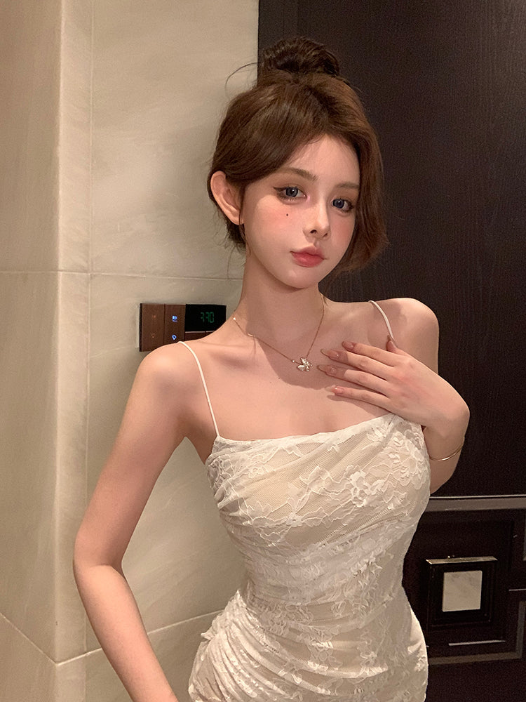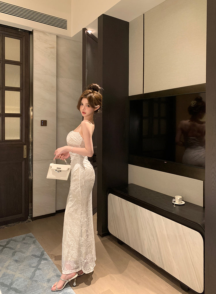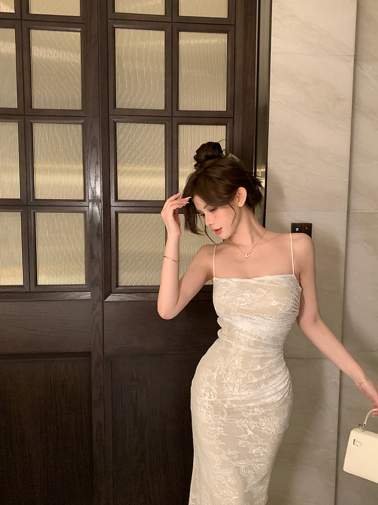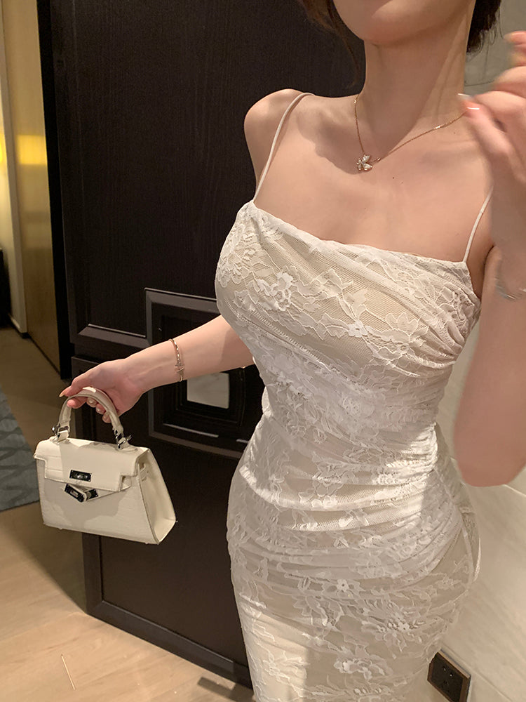 This white lace backless camisole dress features a soft, flowing fabric with delicate lace accents for a fresh, feminine look. Its ruched waist design highlights the figure while providing a naturally flattering silhouette. The long bodycon cut adds elegance without being overly revealing, making it suitable for outings, photos, events, or refined casual styling. The combination of lace, a fitted shape, and a smooth drape creates a graceful and modern aesthetic.