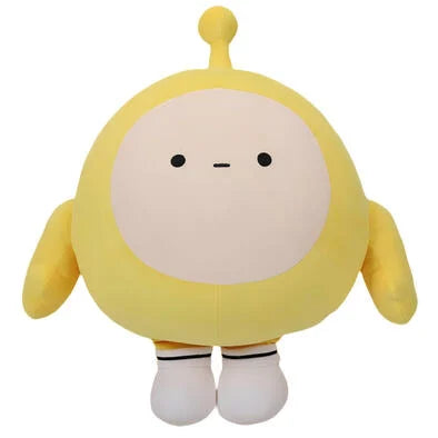 This adorable soft plush toy features a charming, round yellow character design. It has small white feet with striped socks, little arms, and a small green sprout accent on top. Made from a soft, huggable material, this plush is perfect for cuddling or as a fun decorative item. It is a cute addition to any toy collection and can be enjoyed by all ages.